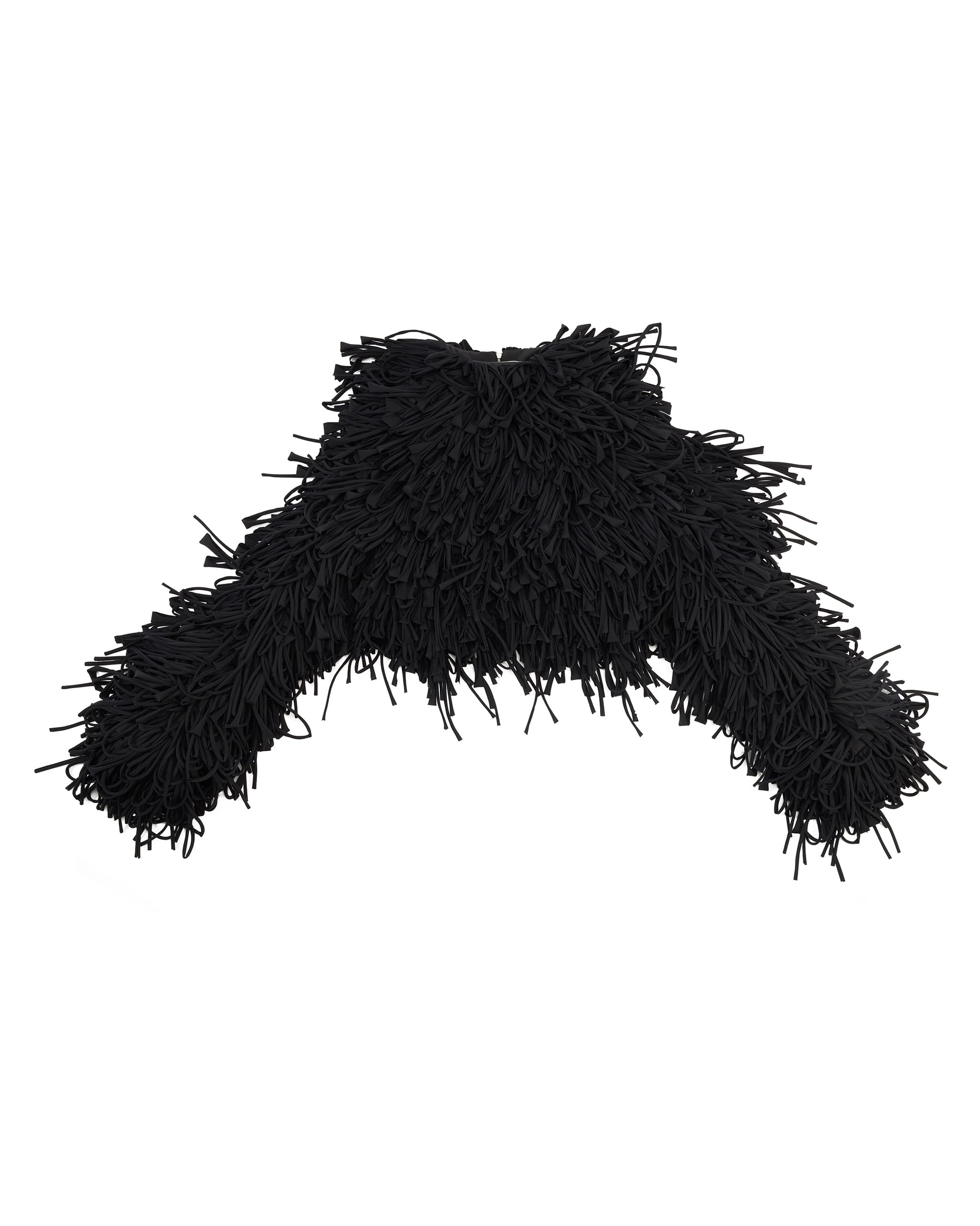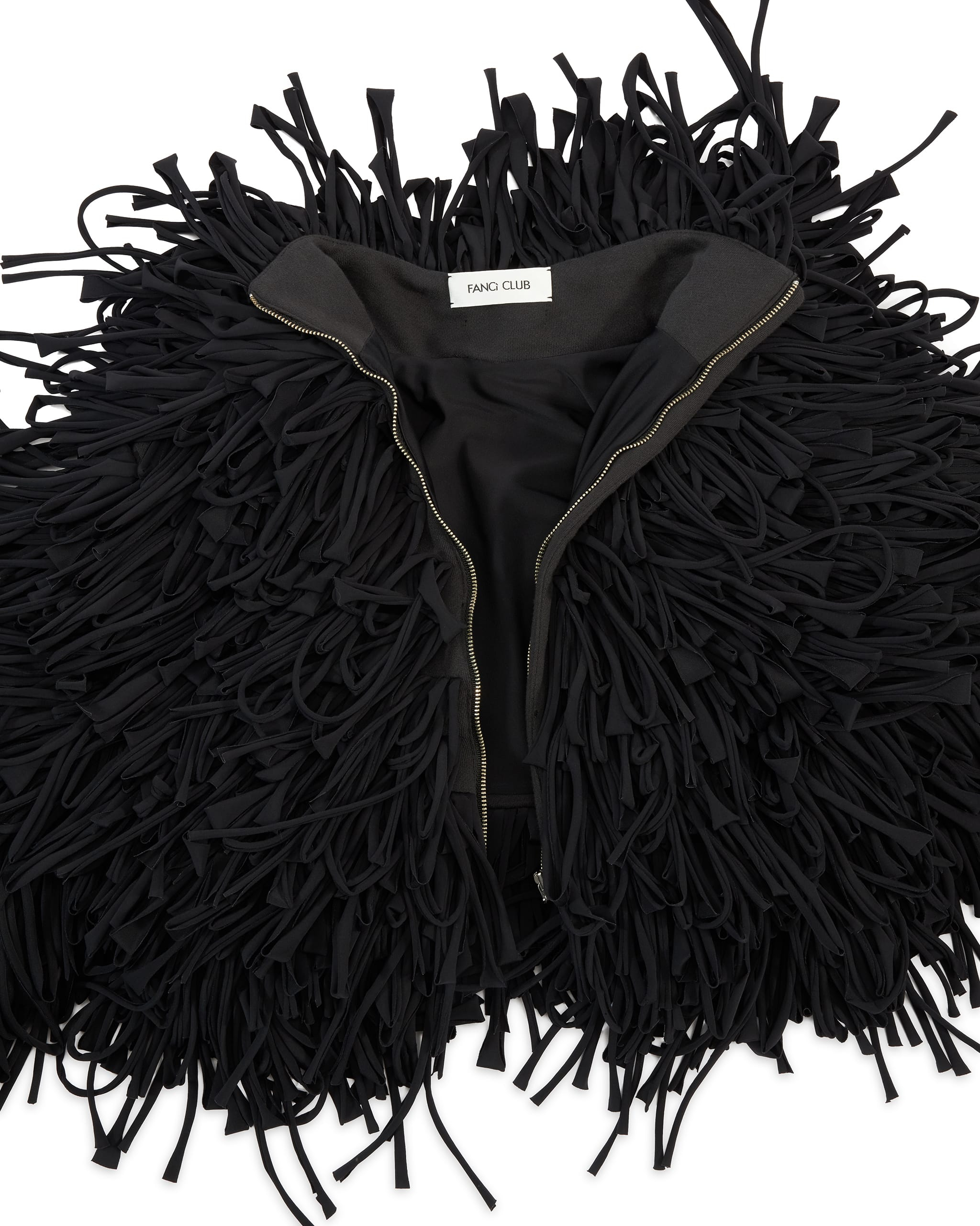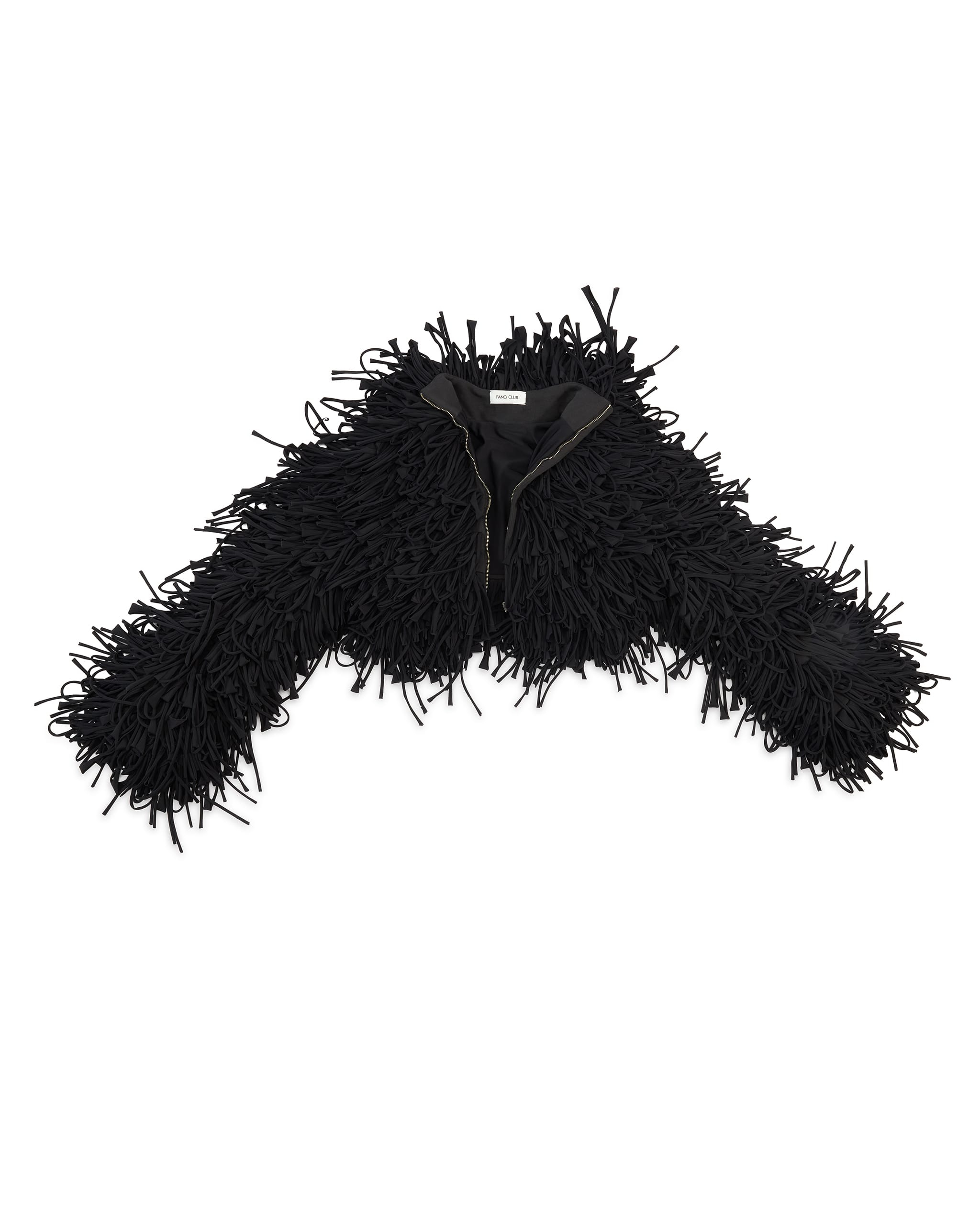 Long sleeves fringe crop coat Zip closure at the back Raw edge tassels Full viscose lining