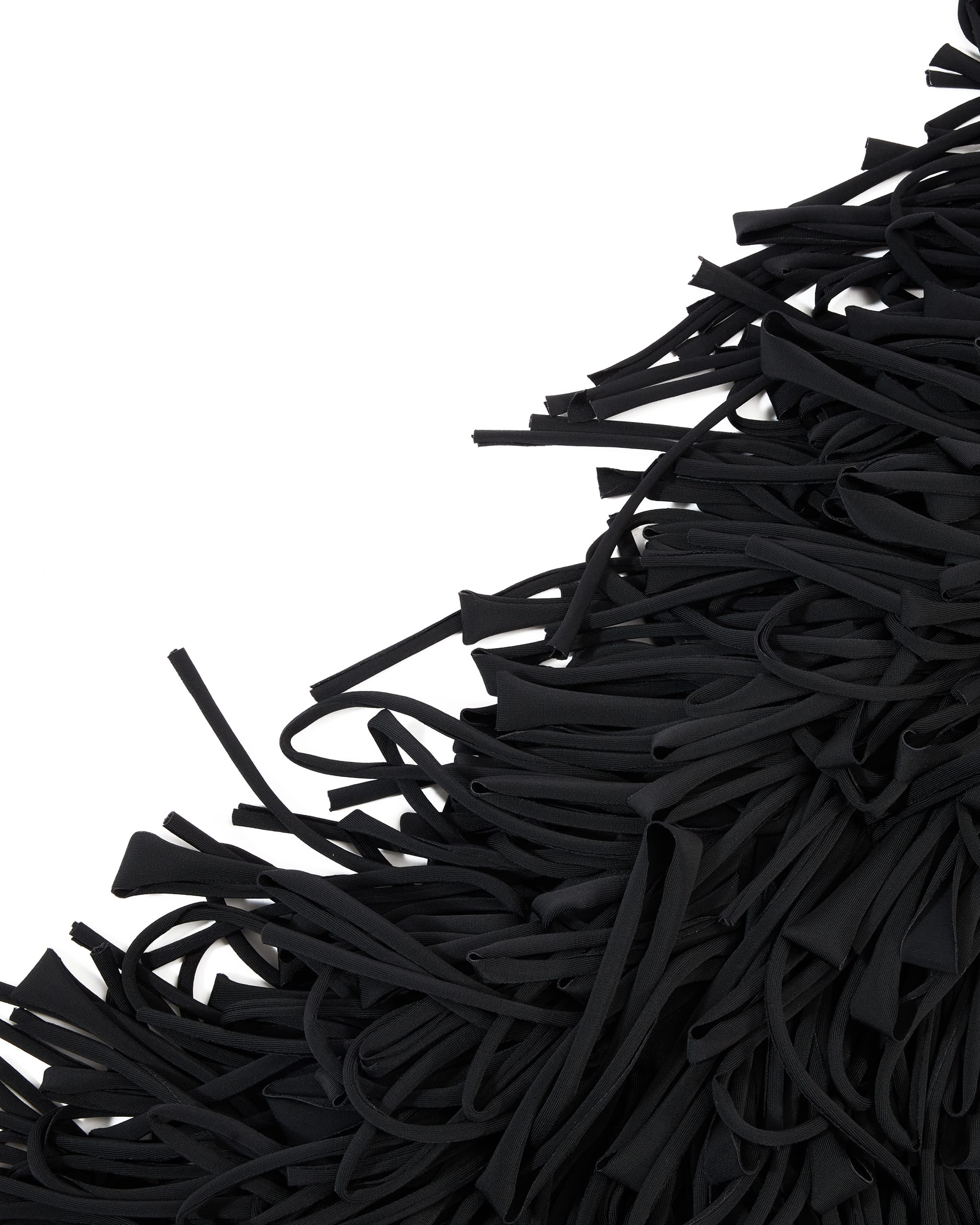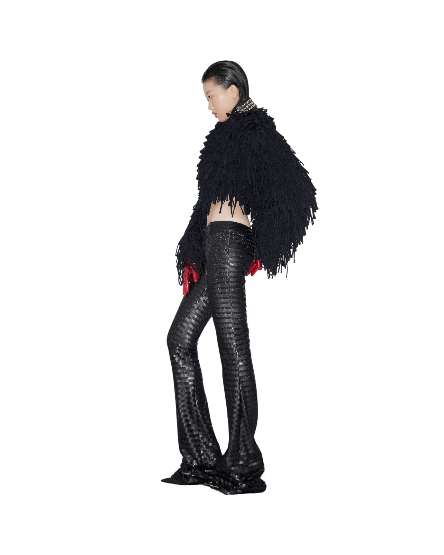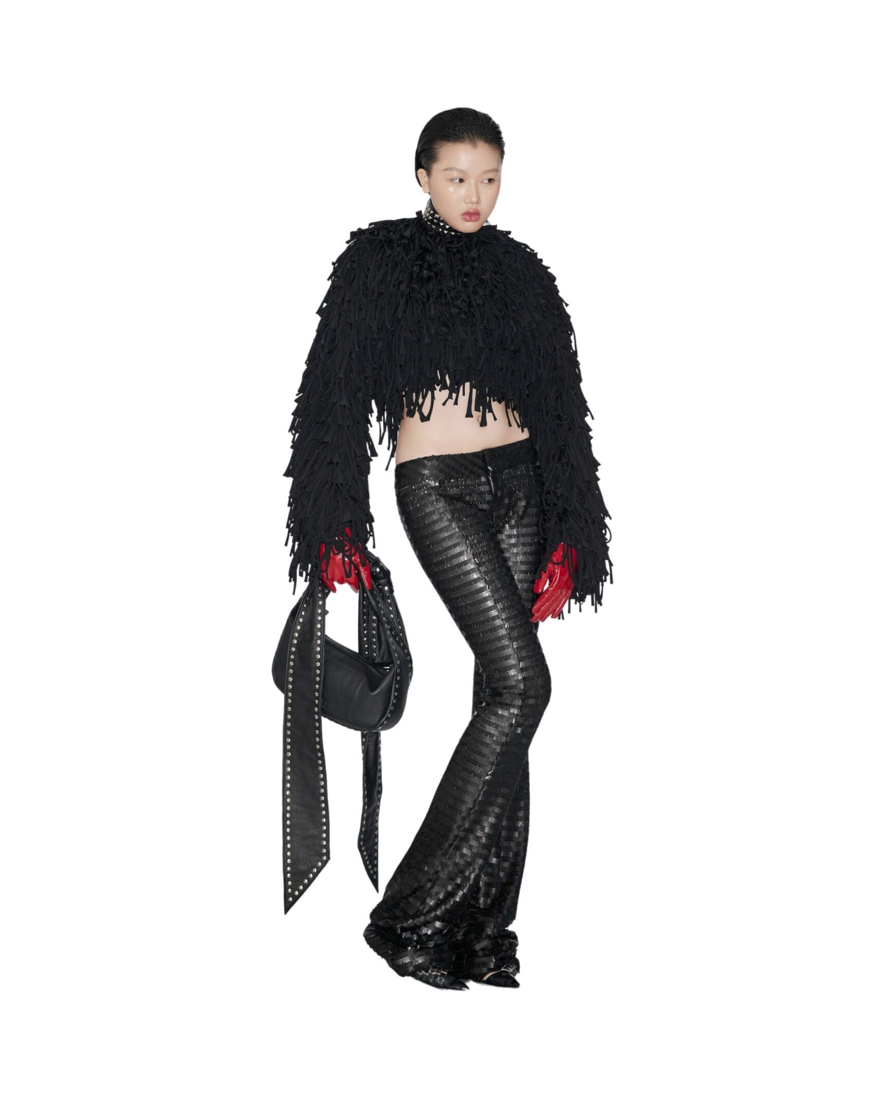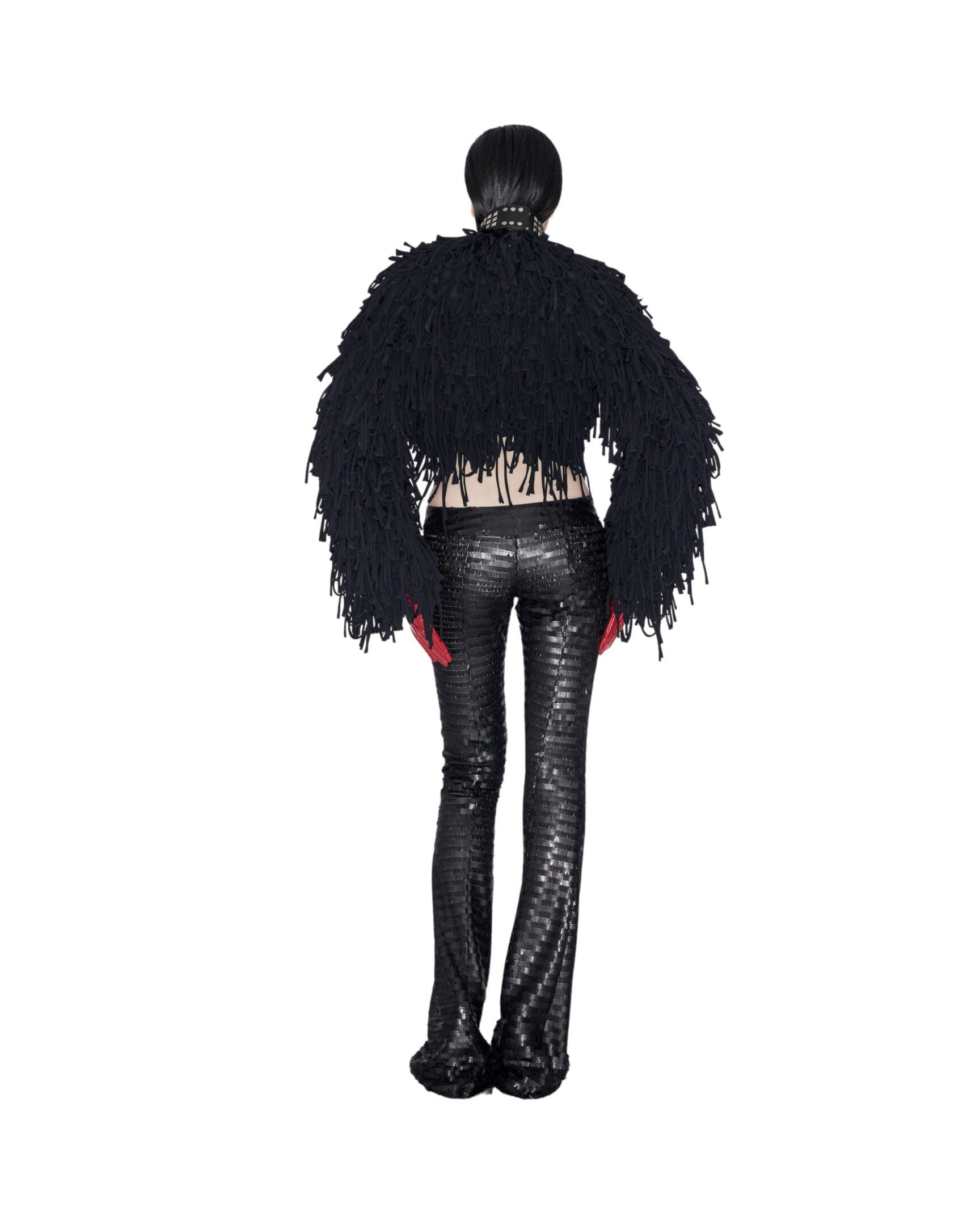 Long sleeves fringe crop coat Zip closure at the back Raw edge tassels Full viscose lining