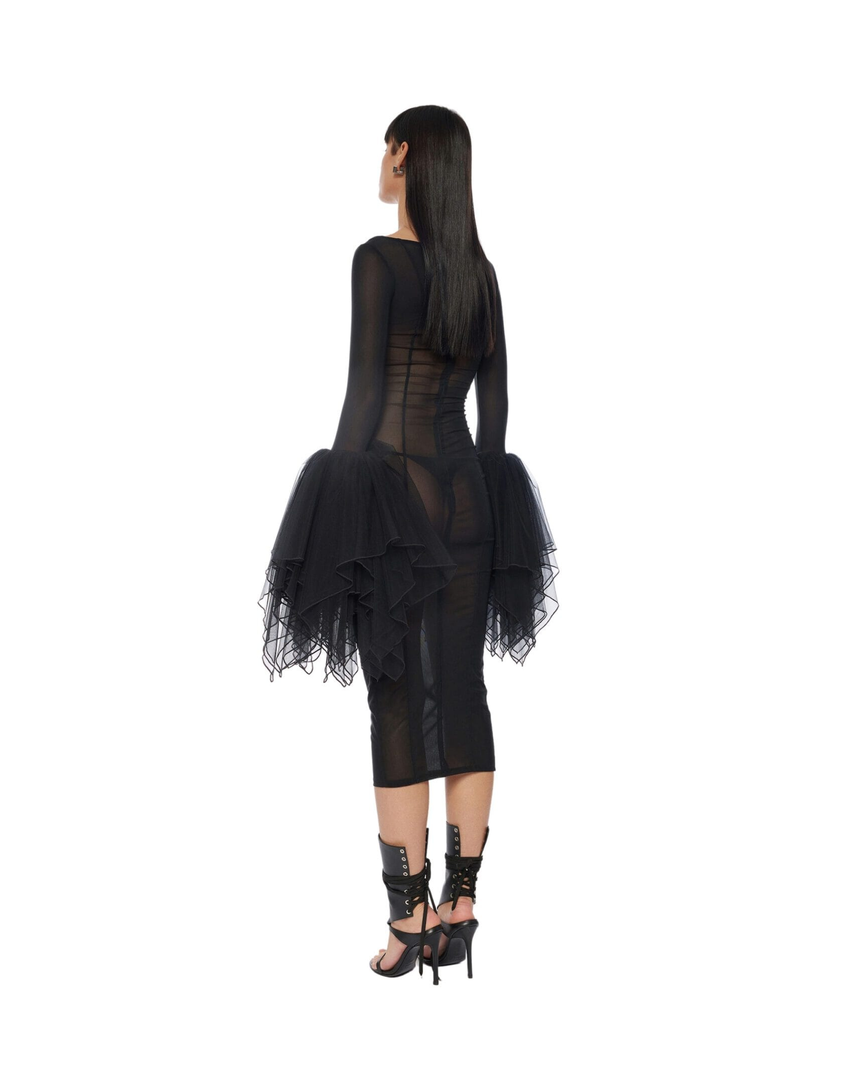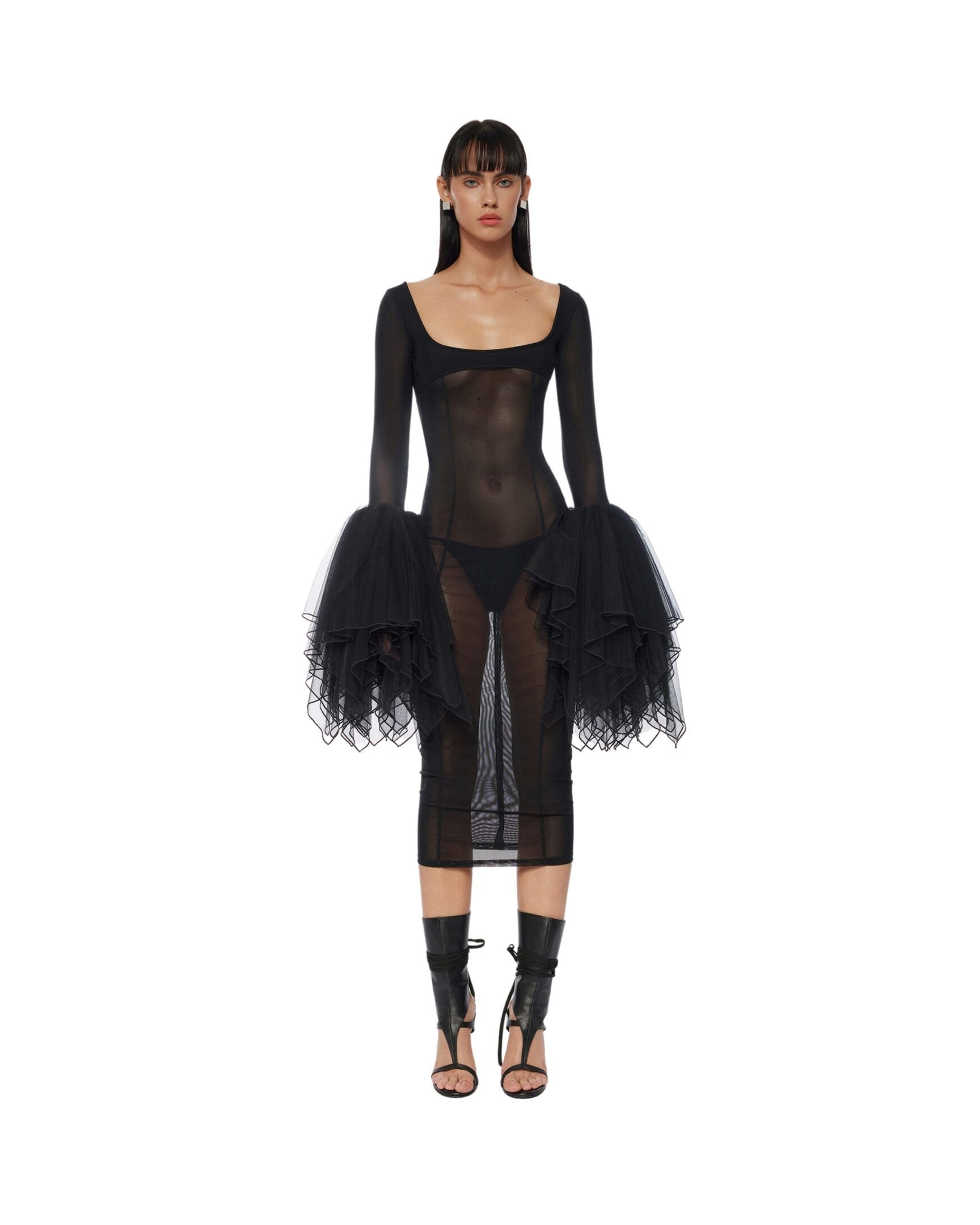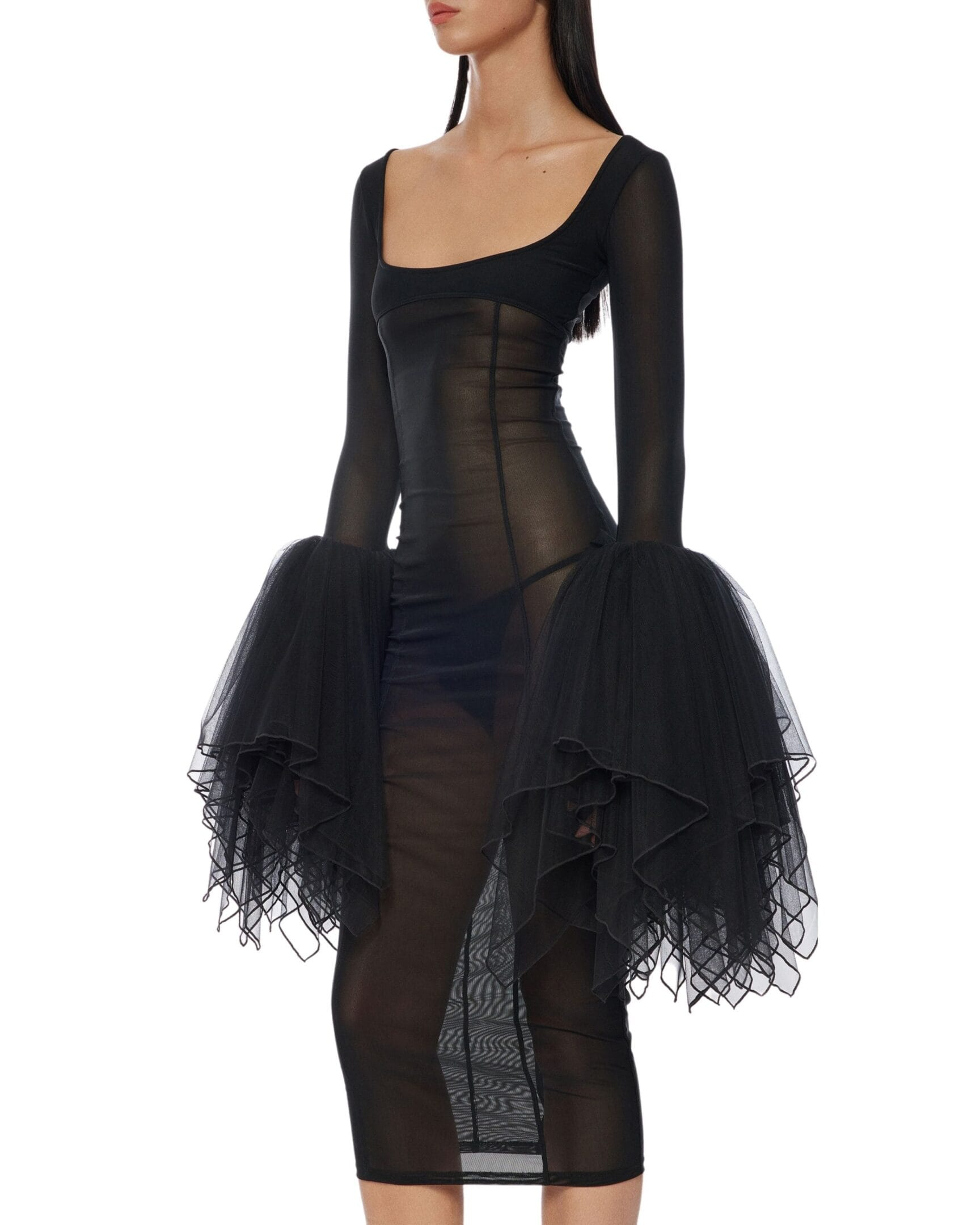Semi-sheer stretch nylon mesh with ruffles cuffs midi dress