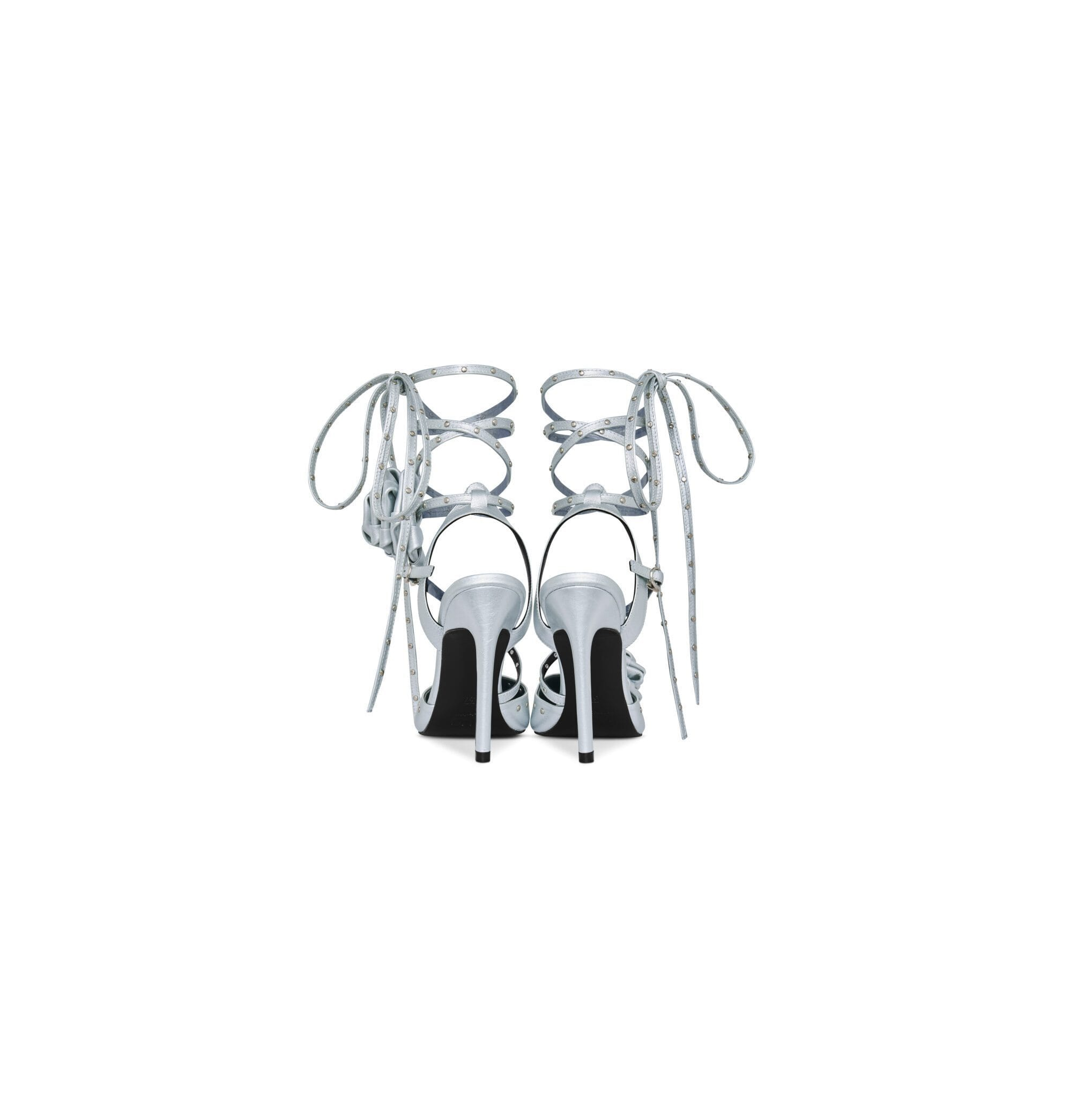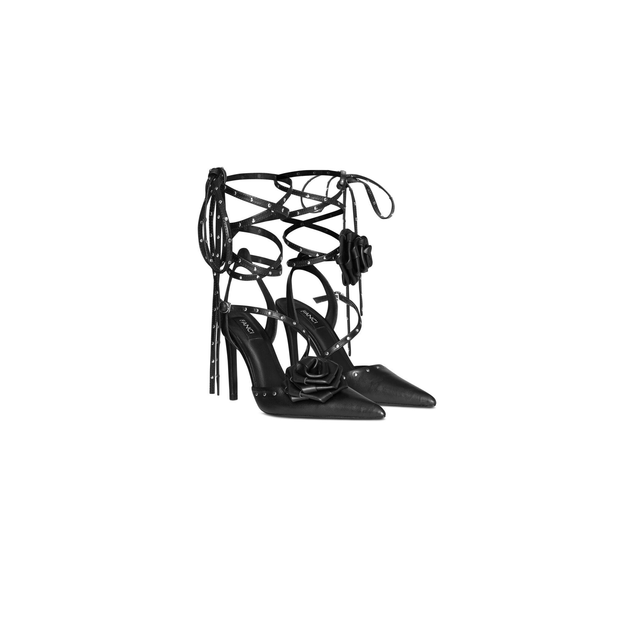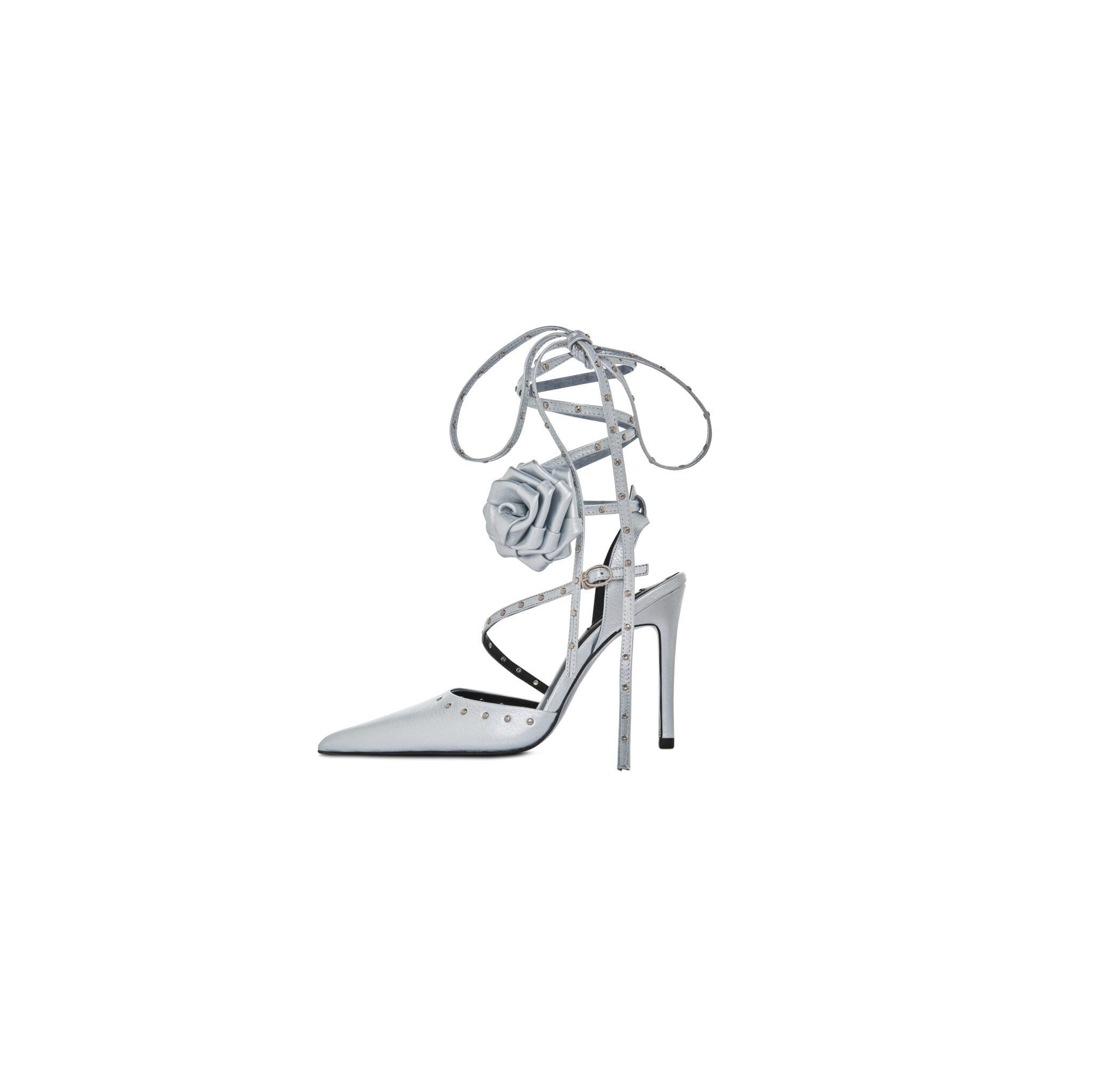Pointed toe, with sheepskin footbed and leather sole Wrapped studded ankle strap with tie closure (with rosette-attached on one side) Logo-imprinted heel