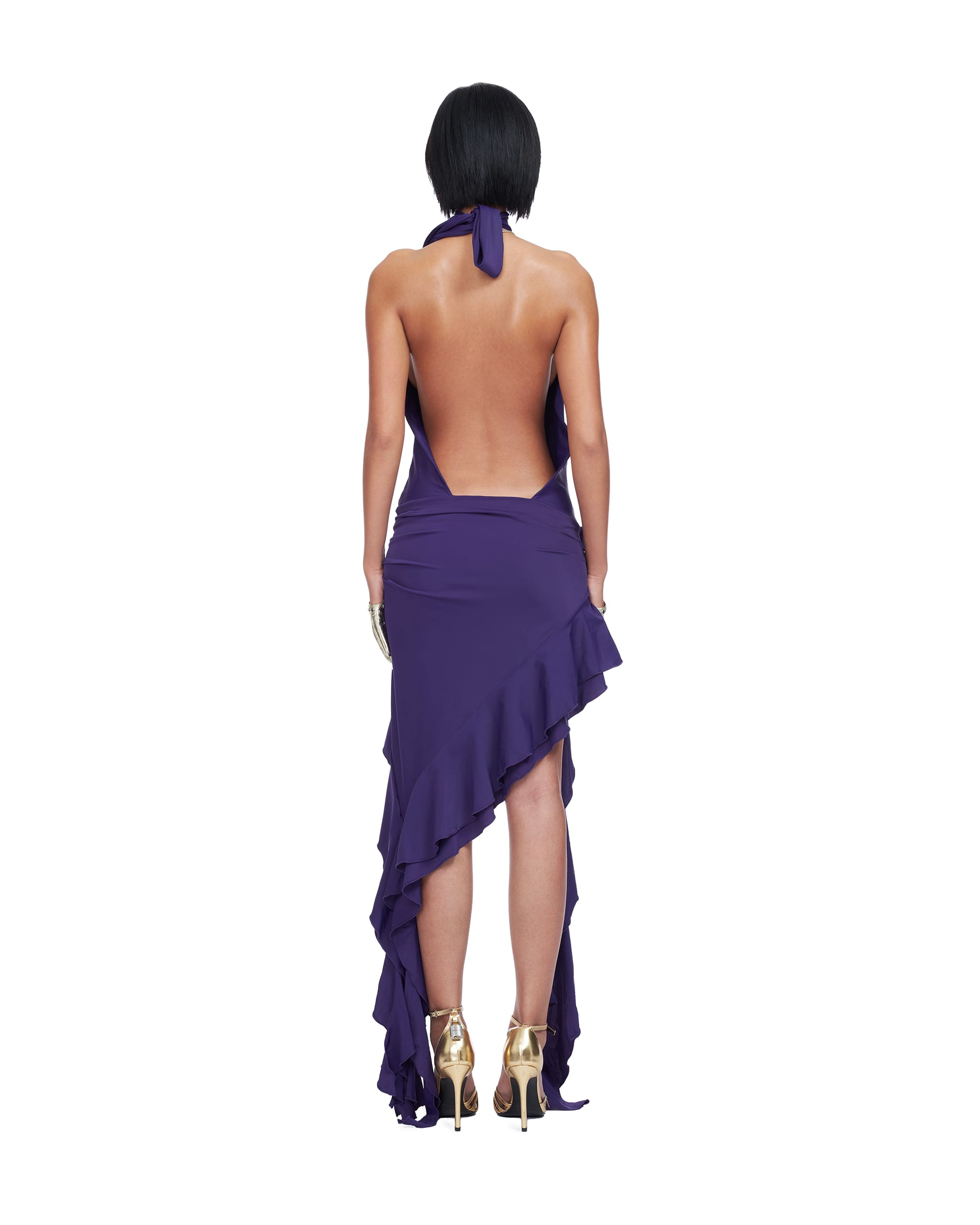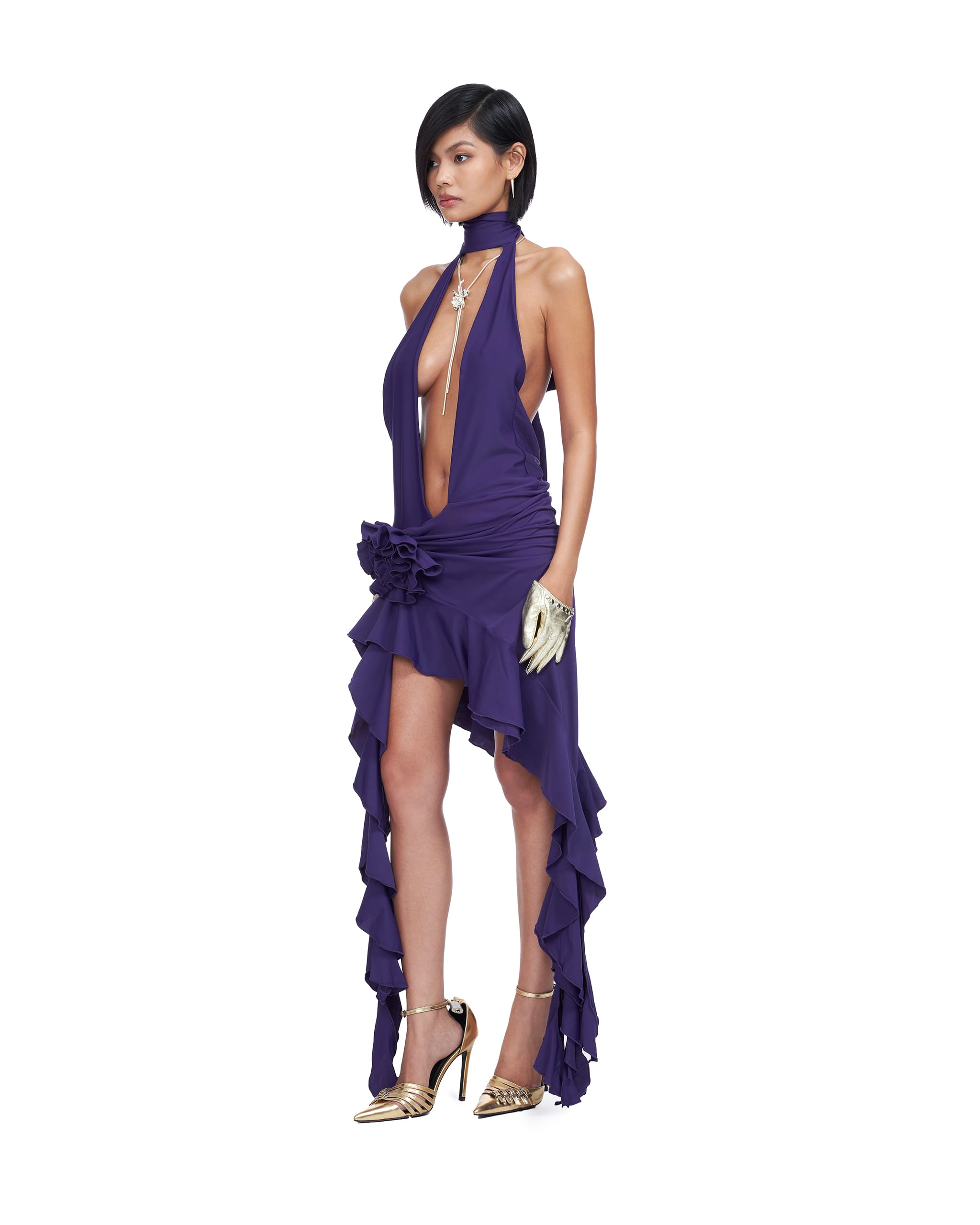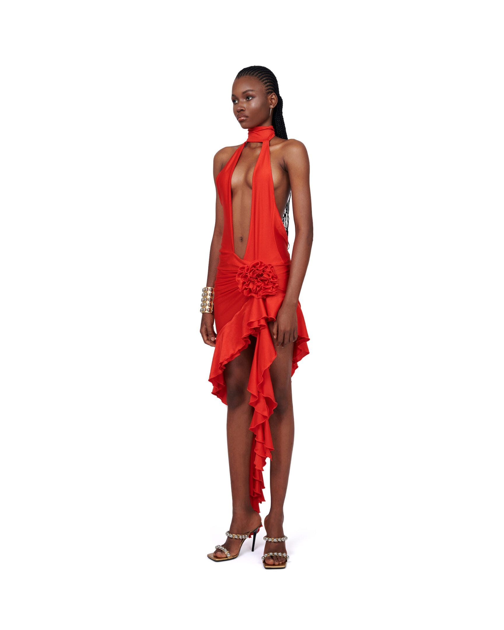 Open front halter neck dress Decorated rosette with ruffle details