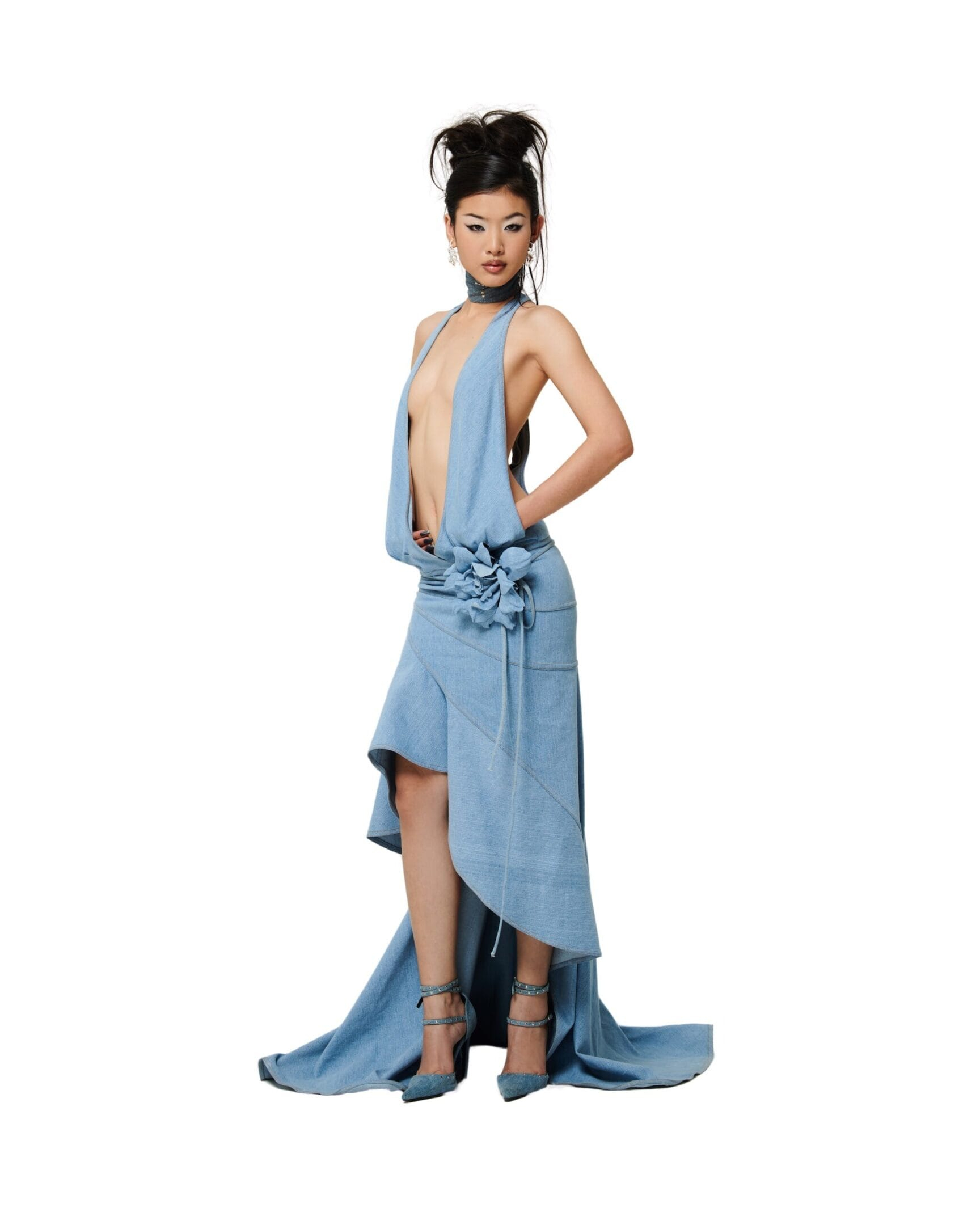 LOW-CUT WATERFALL DENIM GOWN, FLOWER ACCESSORY INCLUDED