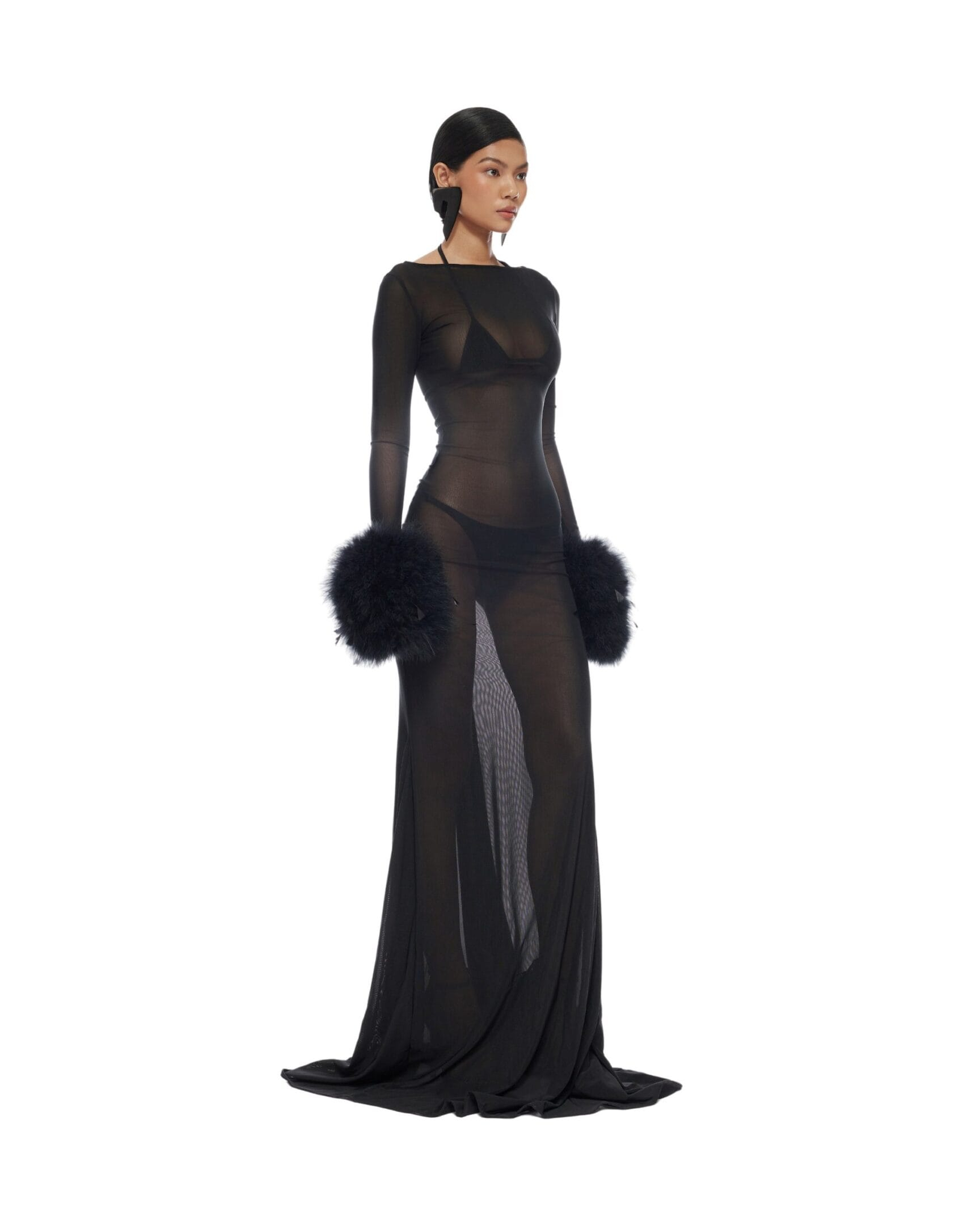 Semi-sheer stretch nylon mesh with real feather cuffs evening gown