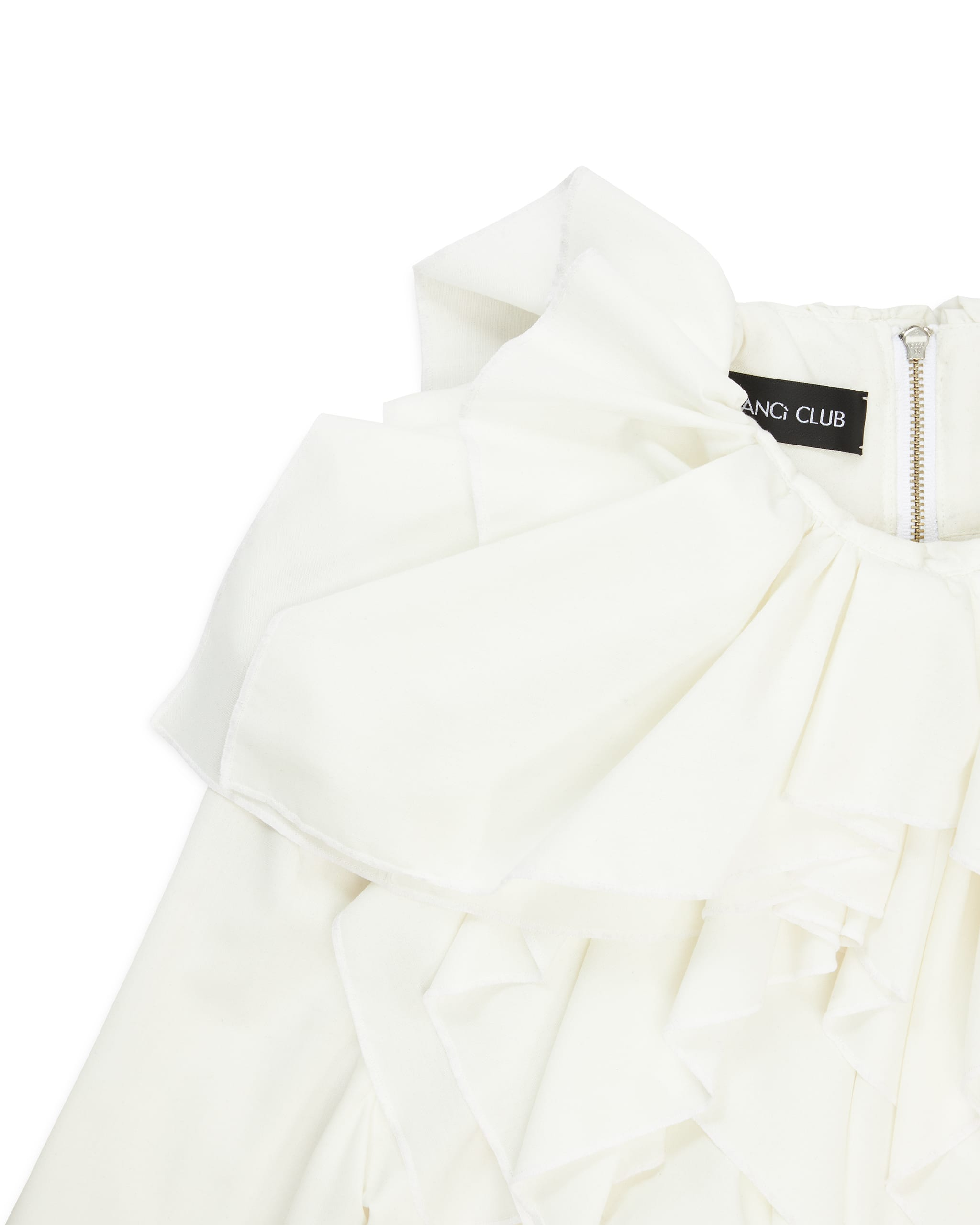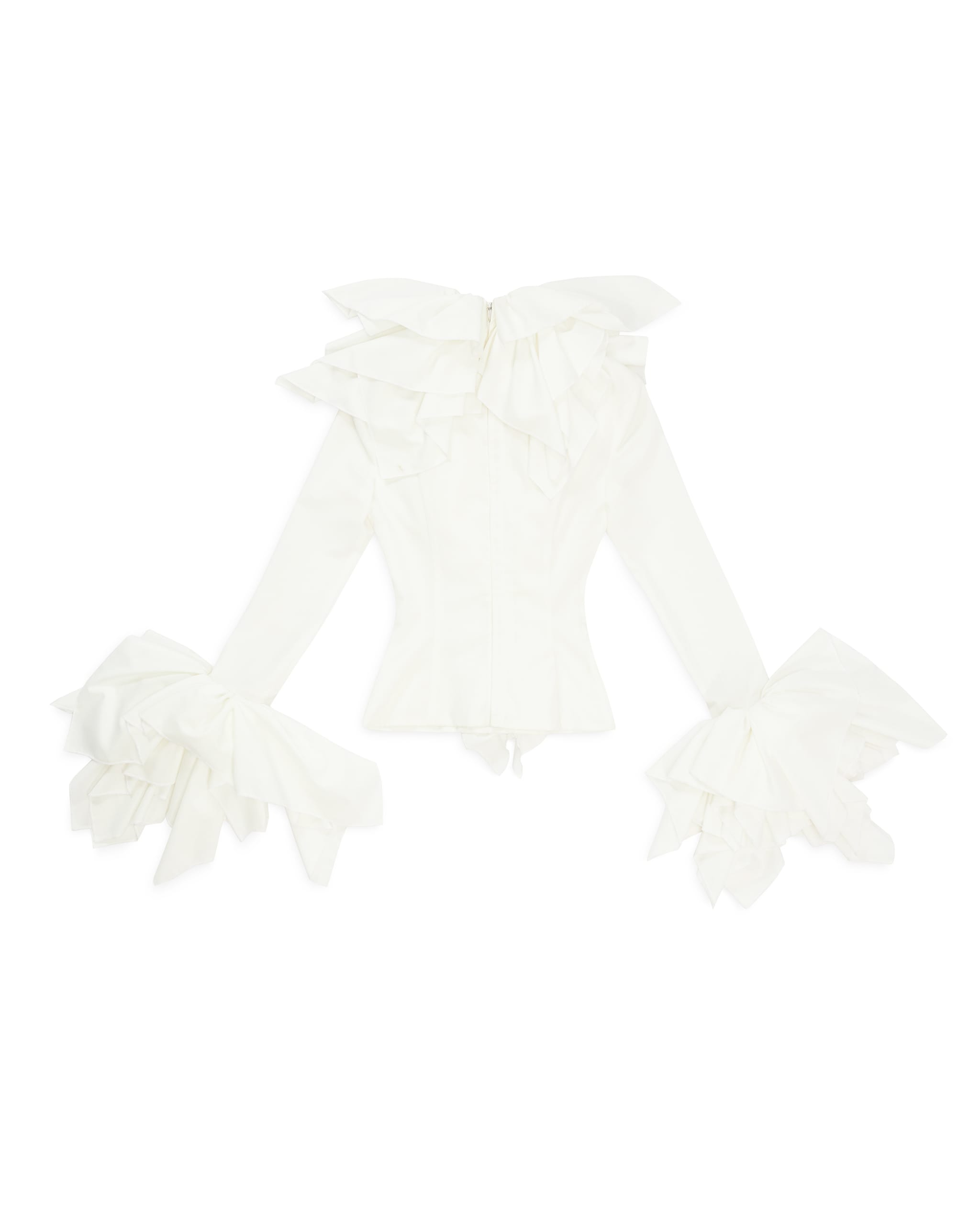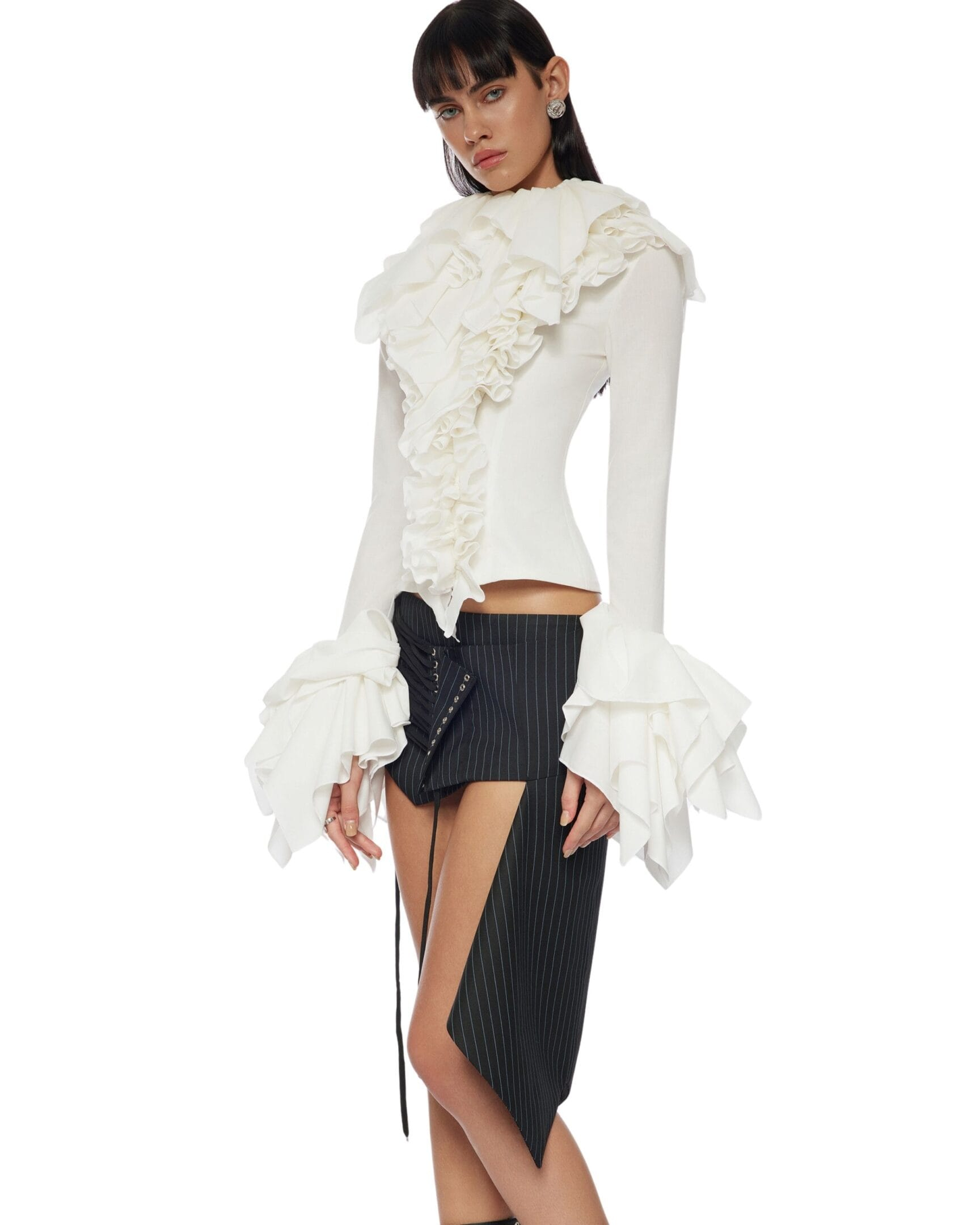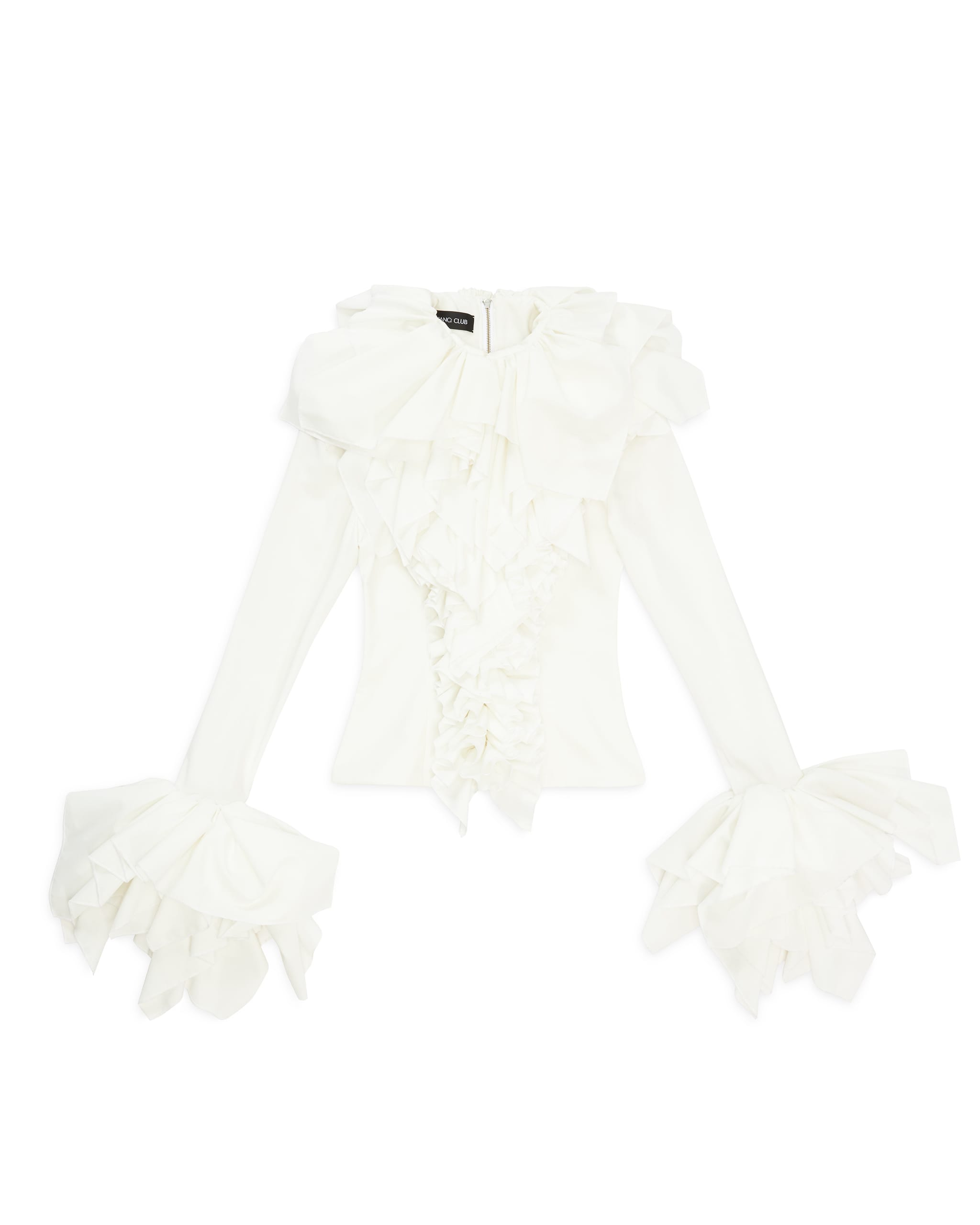 Ruffle at neck down to edge and cuff
