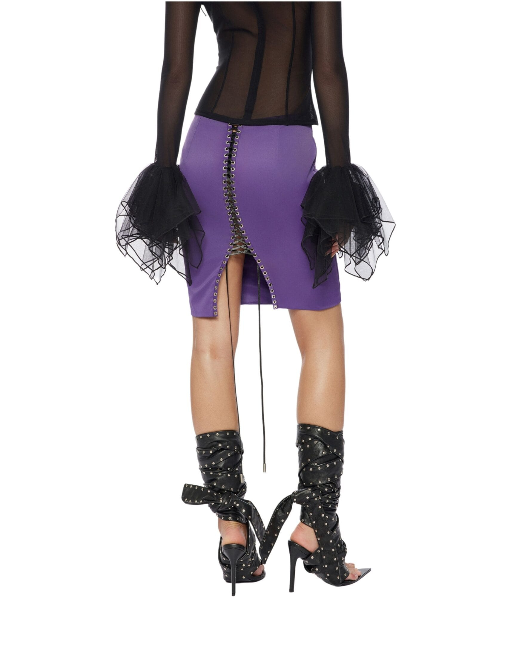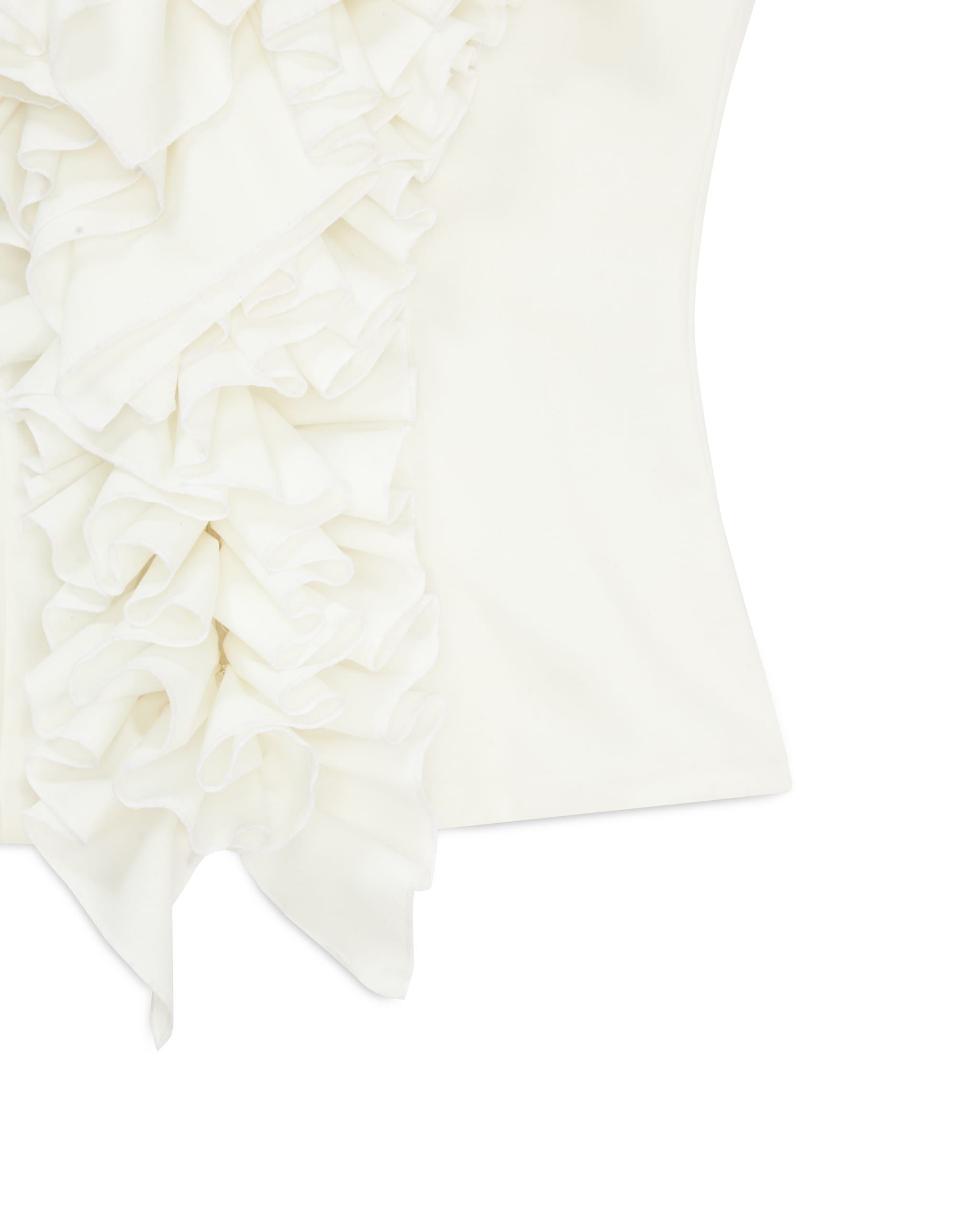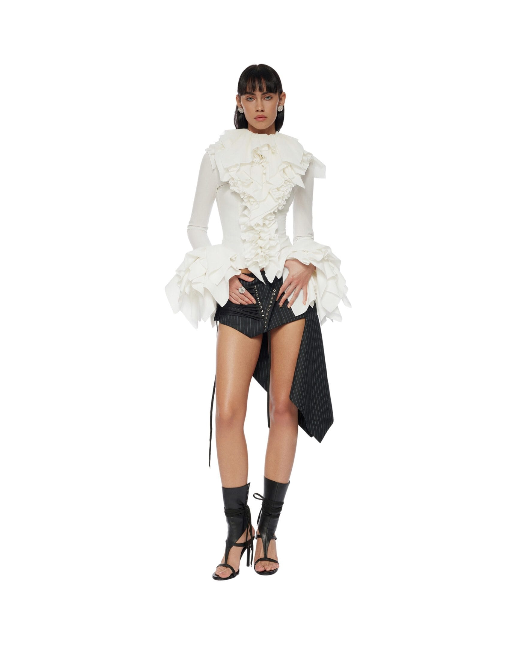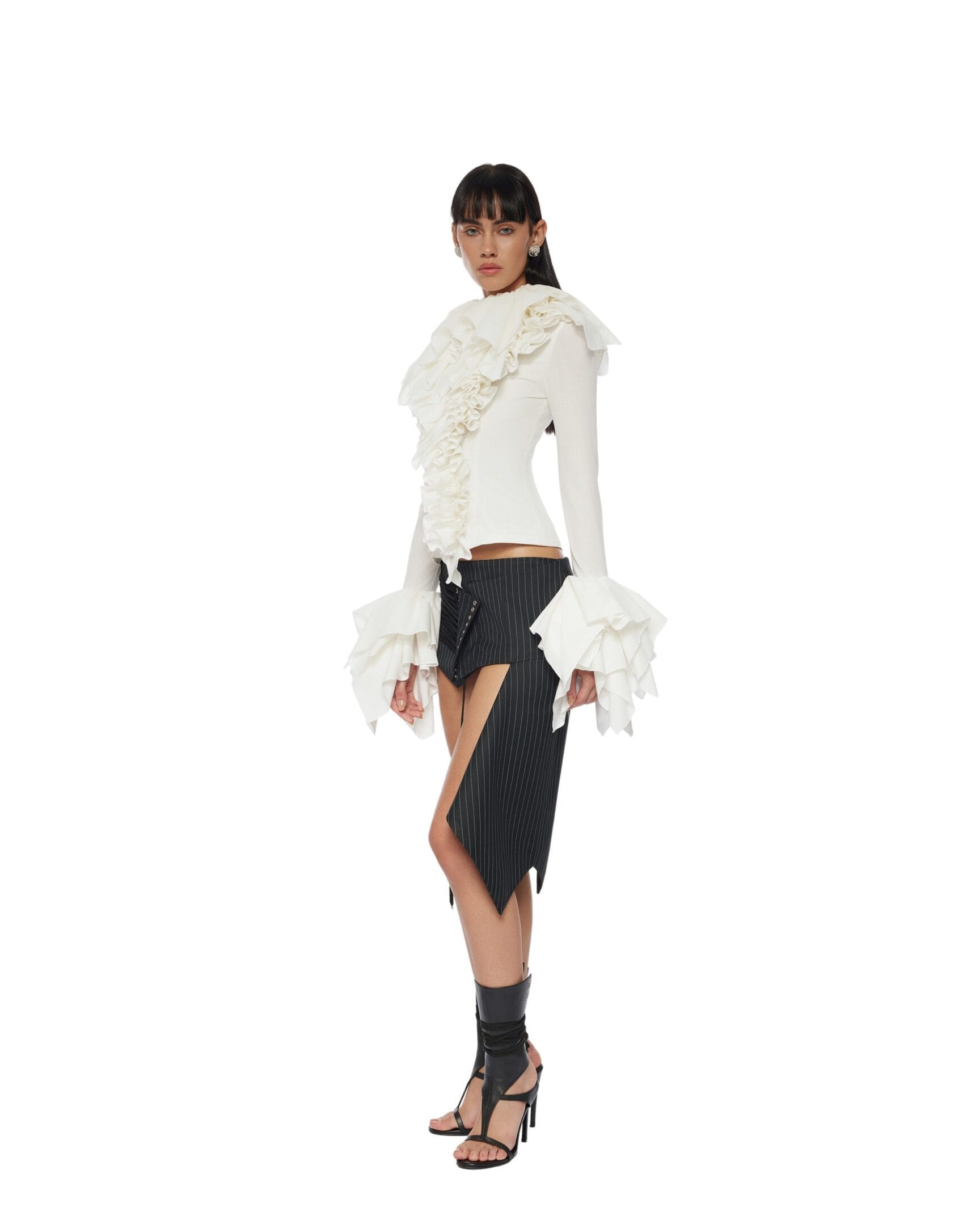 Ruffle at neck down to edge and cuff