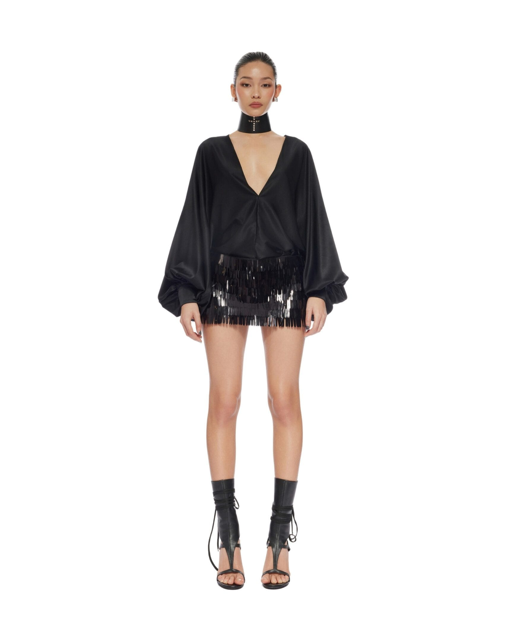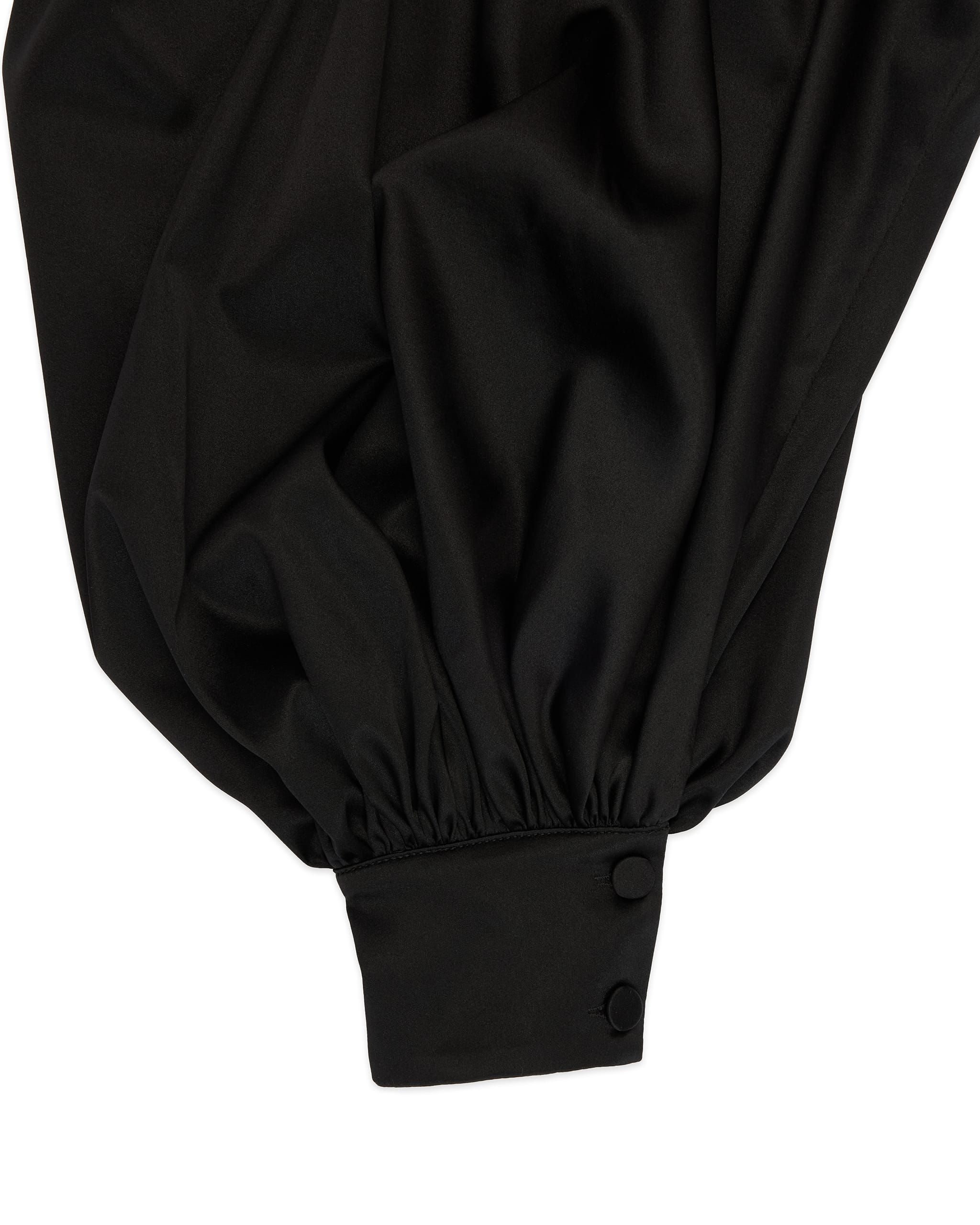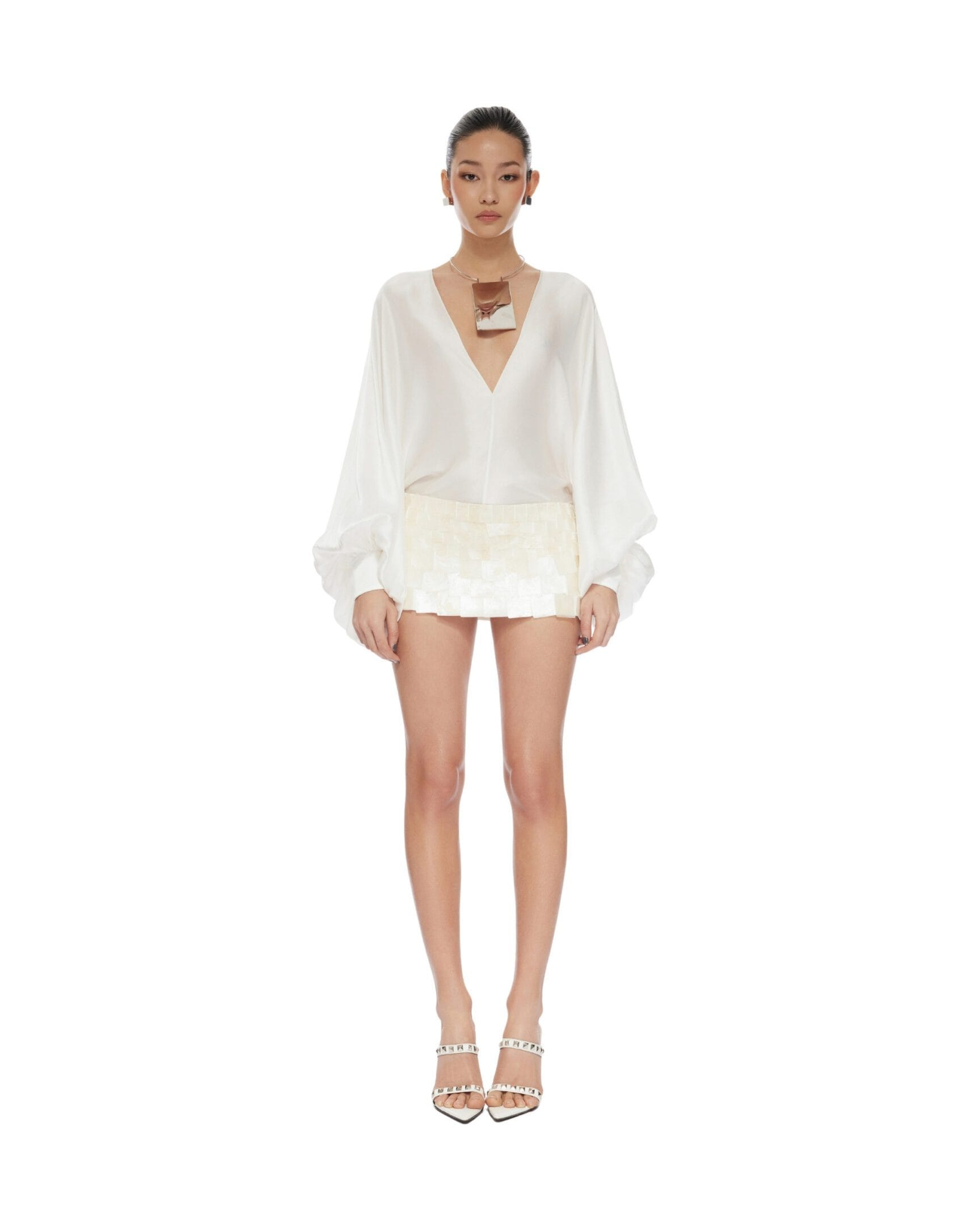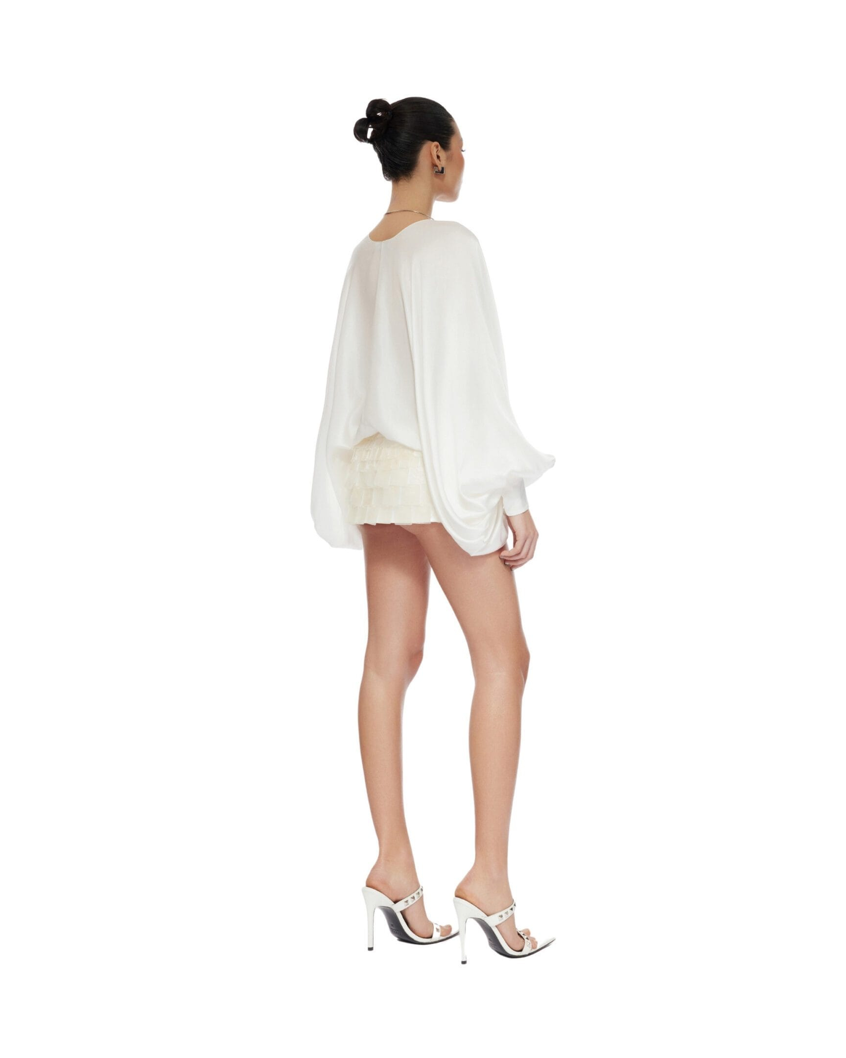 Charmeuse silk V-neck bat wings shirt Rolled hem line Three-button square cuff Unlined