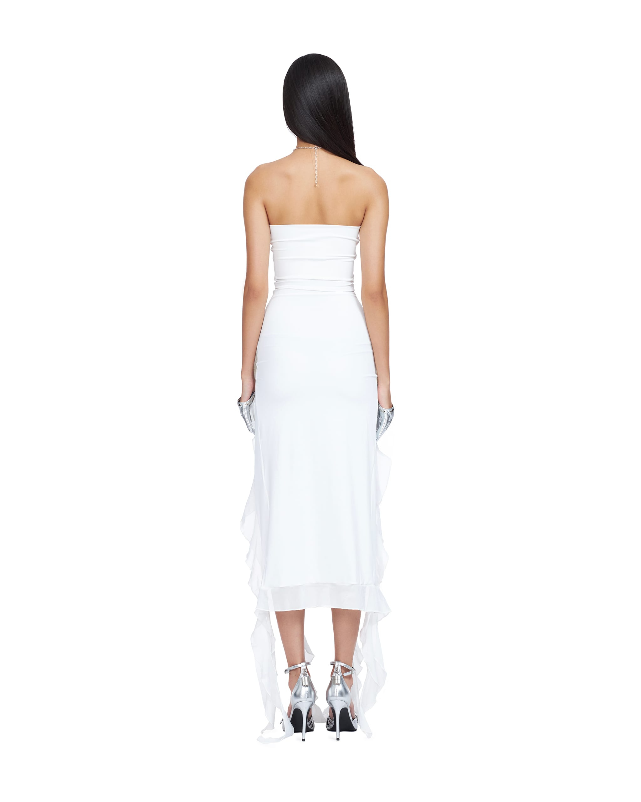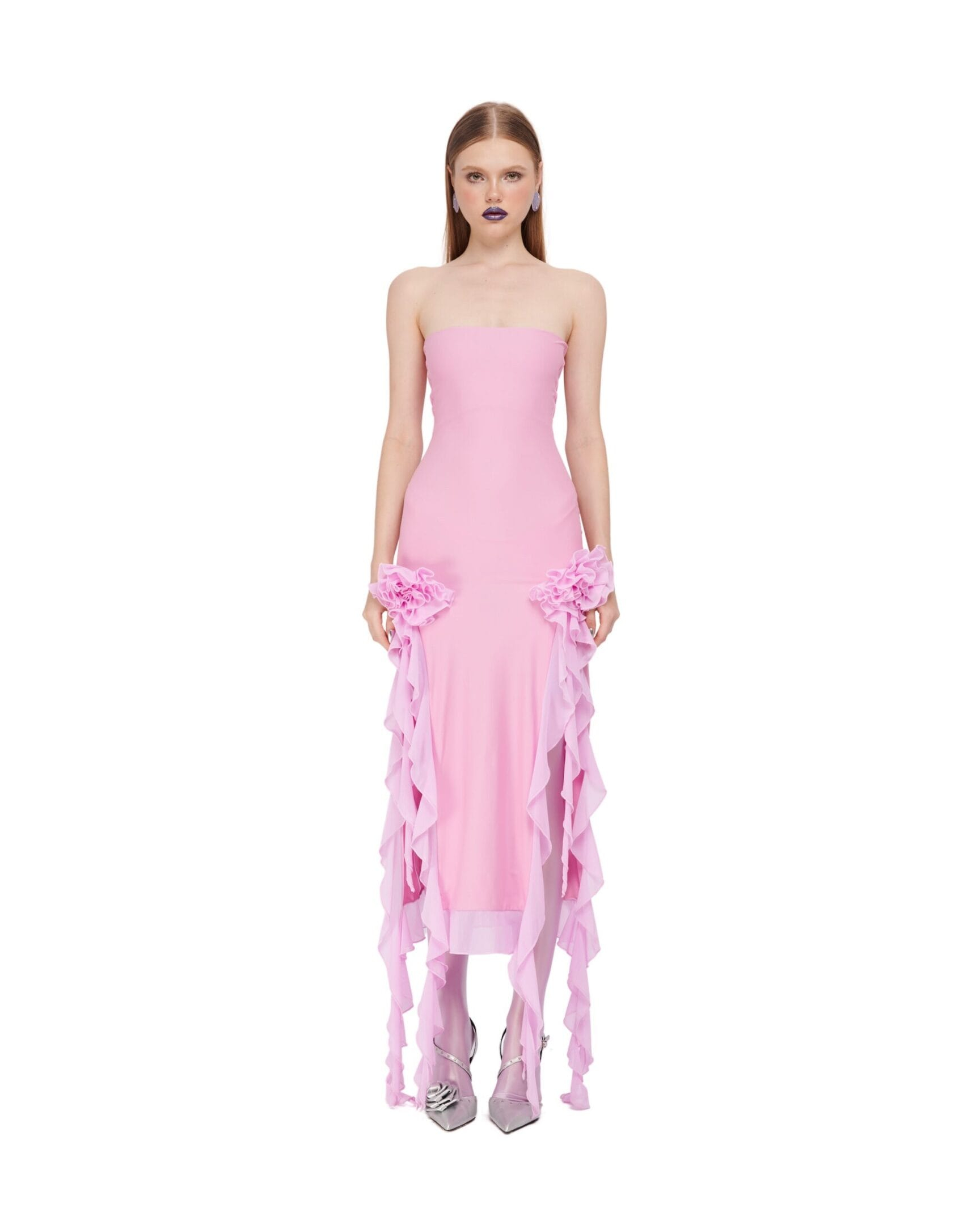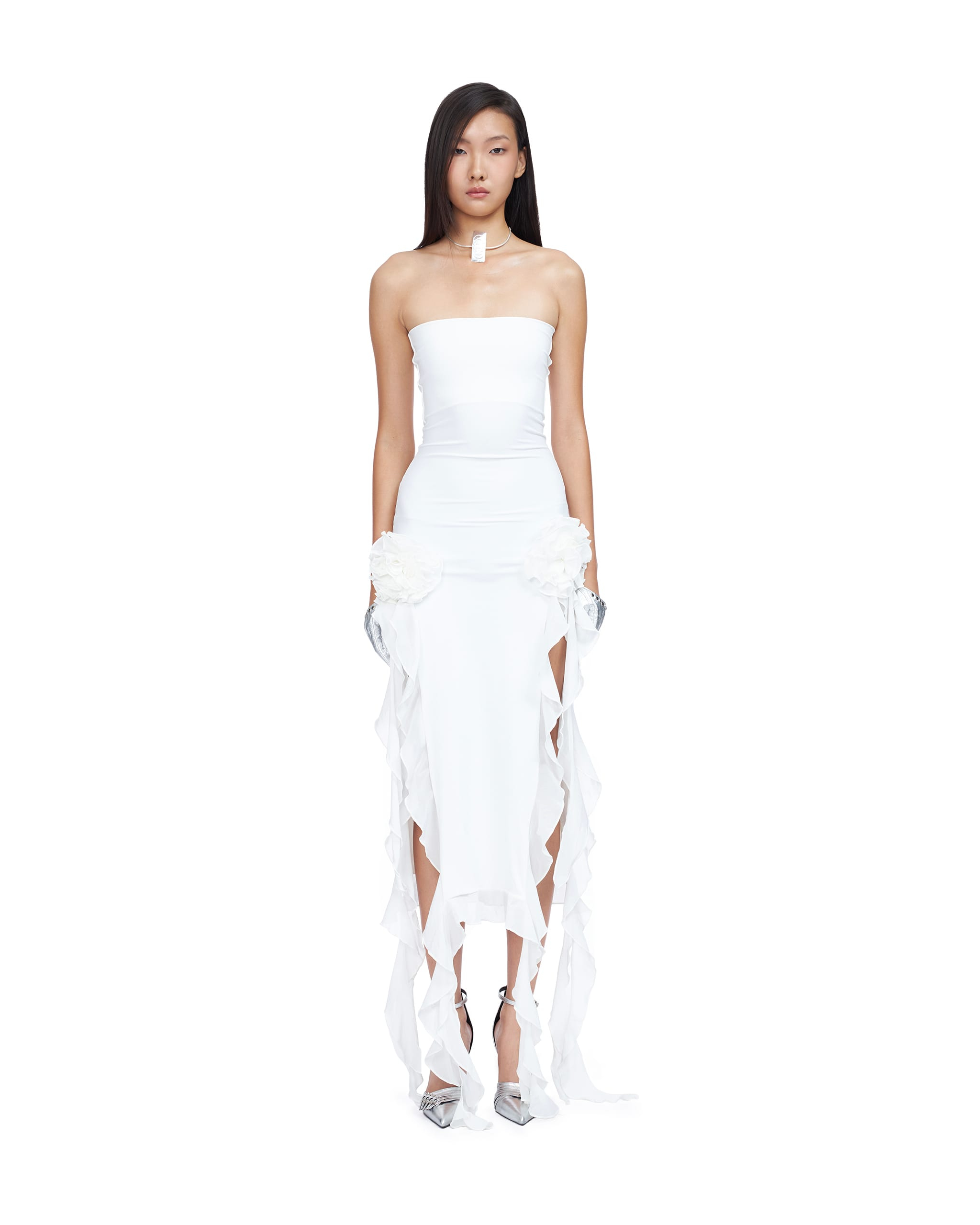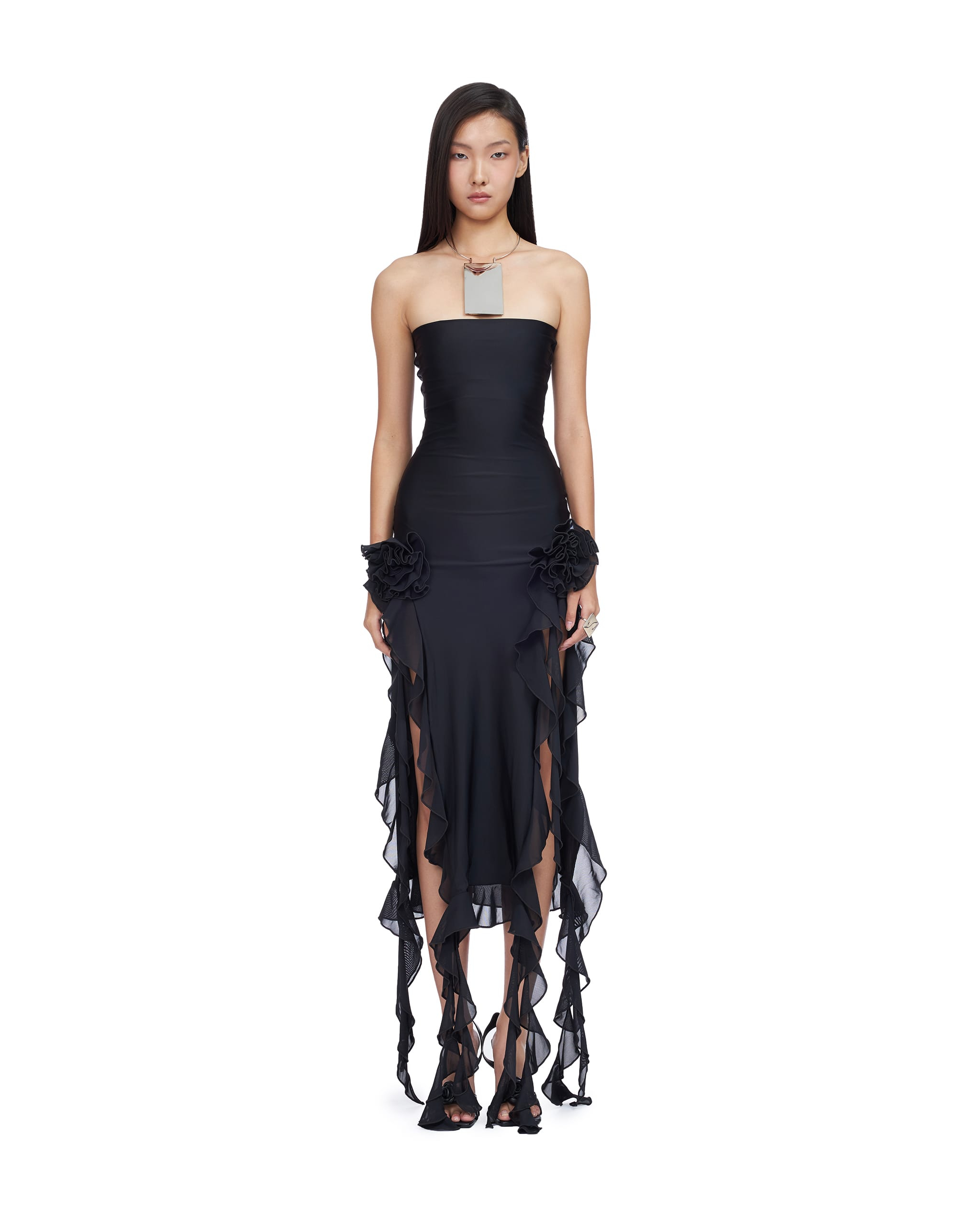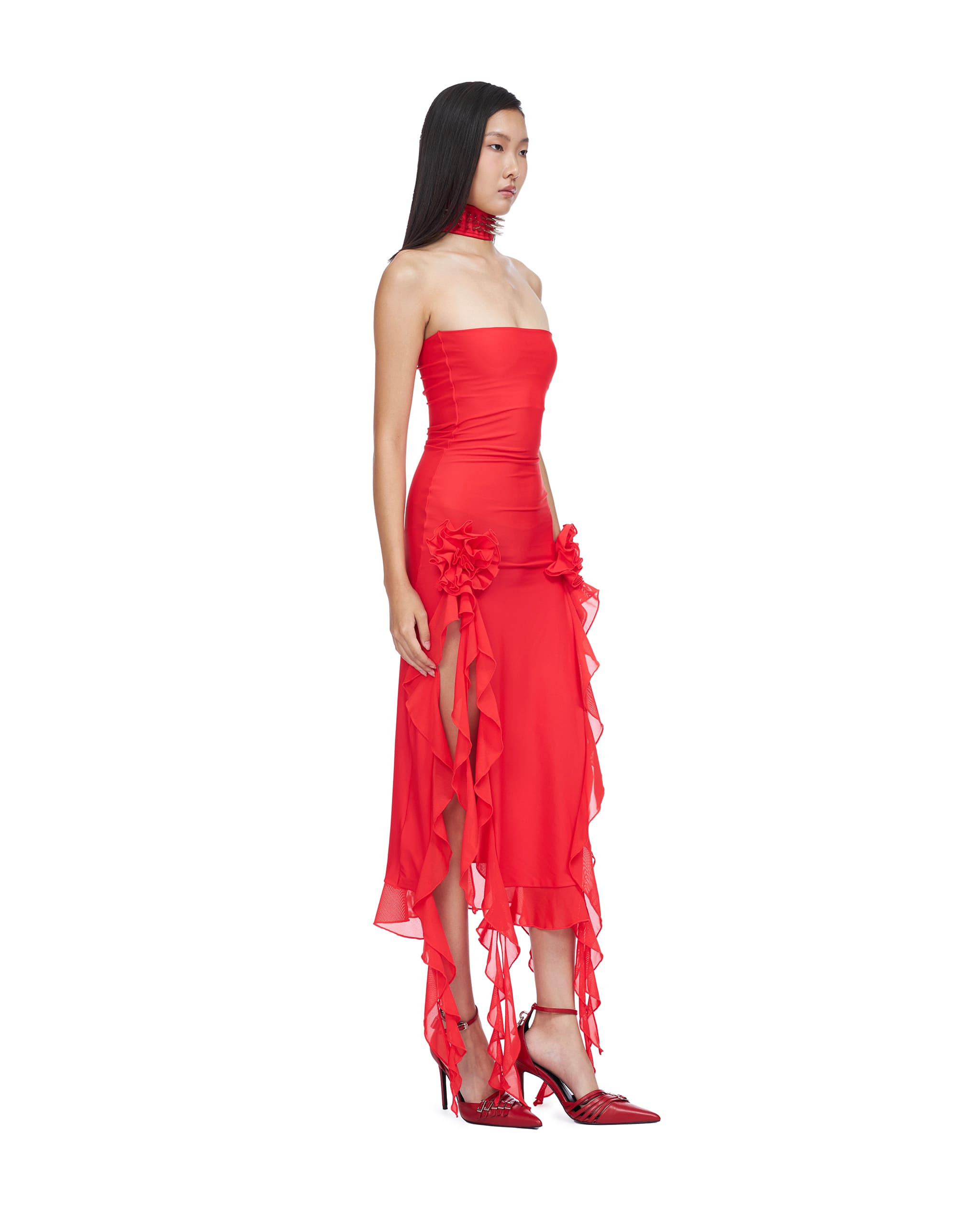 Nylon spandex high-cut slit gown decorated with rosette and ruffle details. The choker is NOT included with the item.