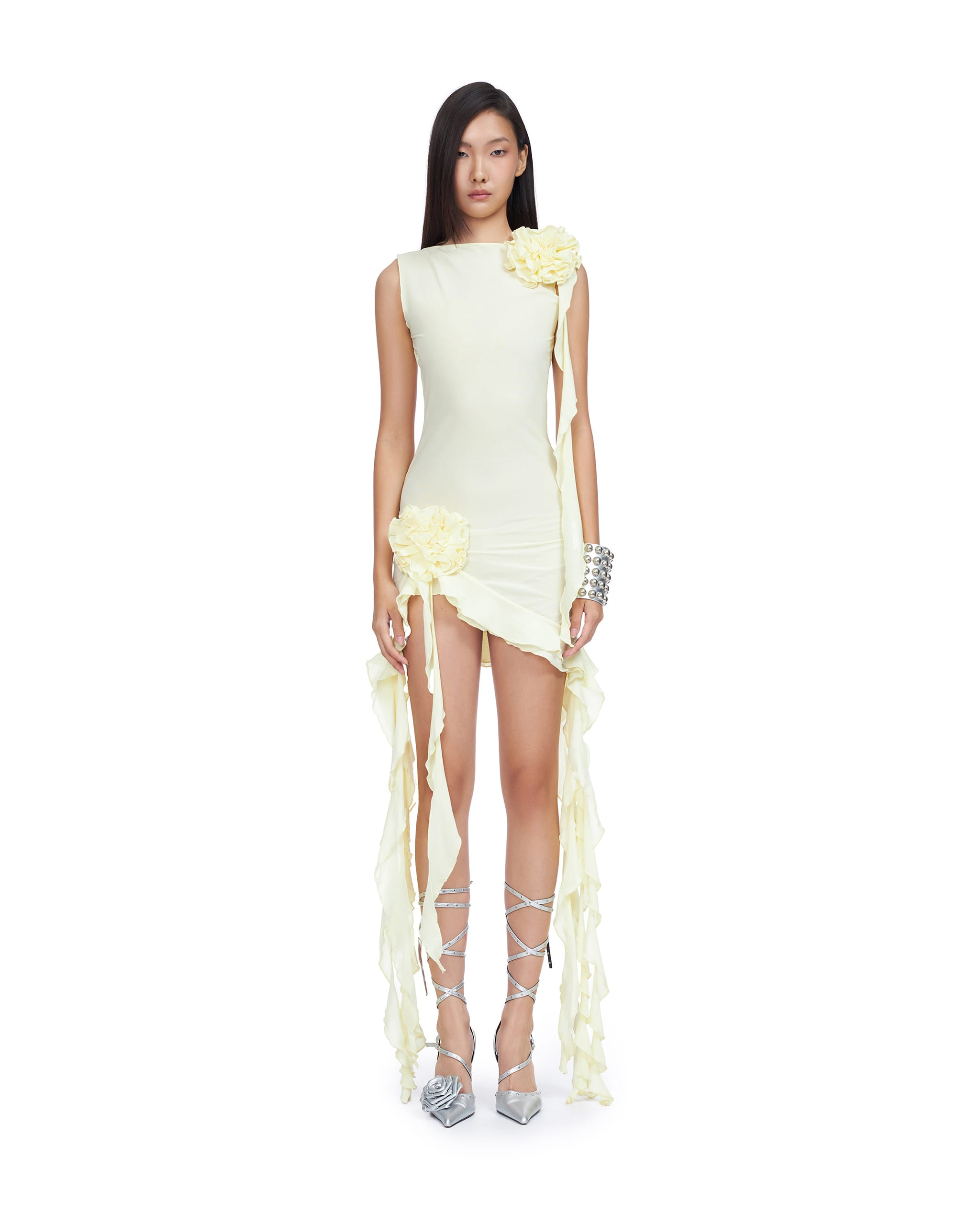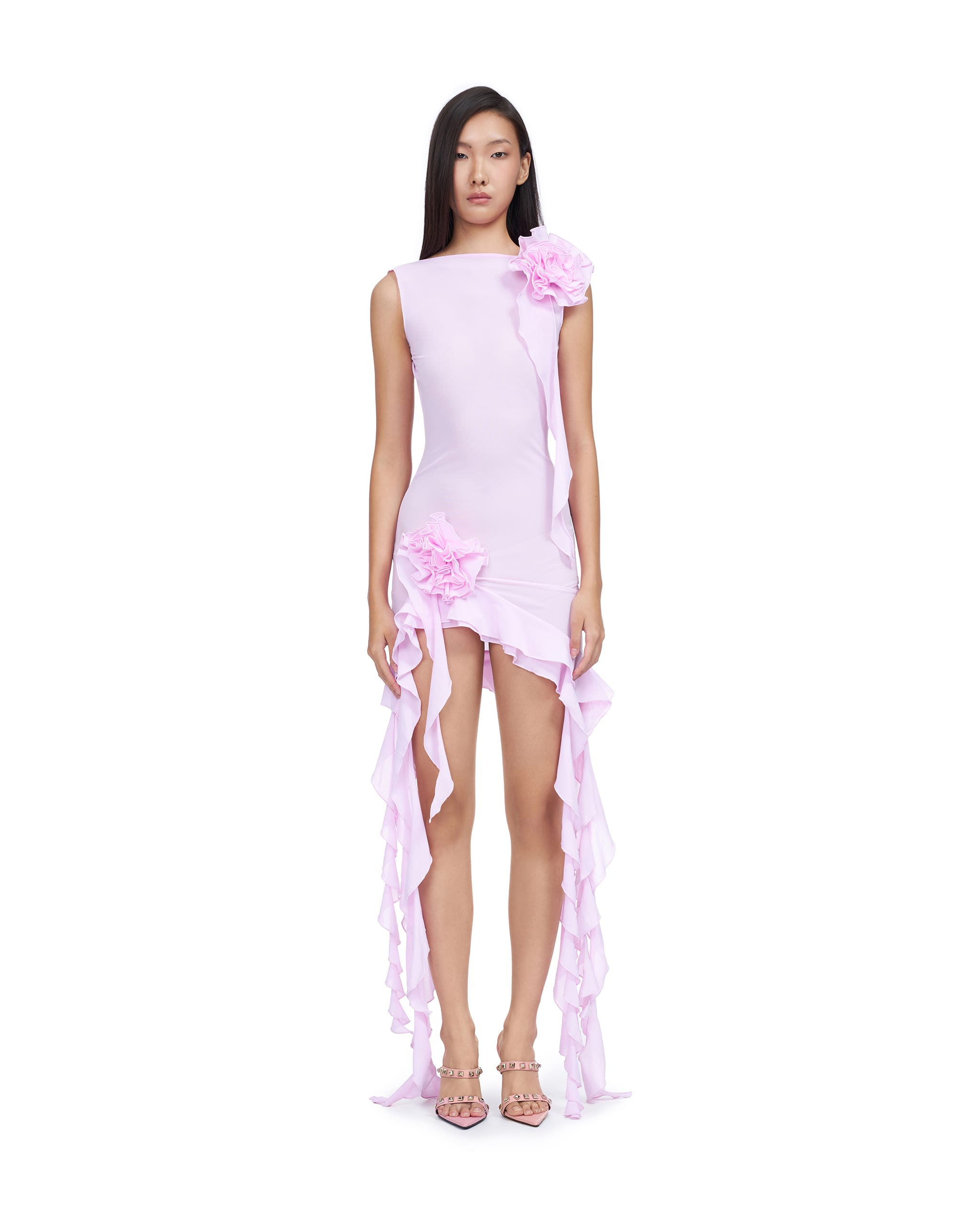 Spandex mesh cocktail dress with ruffle rosette