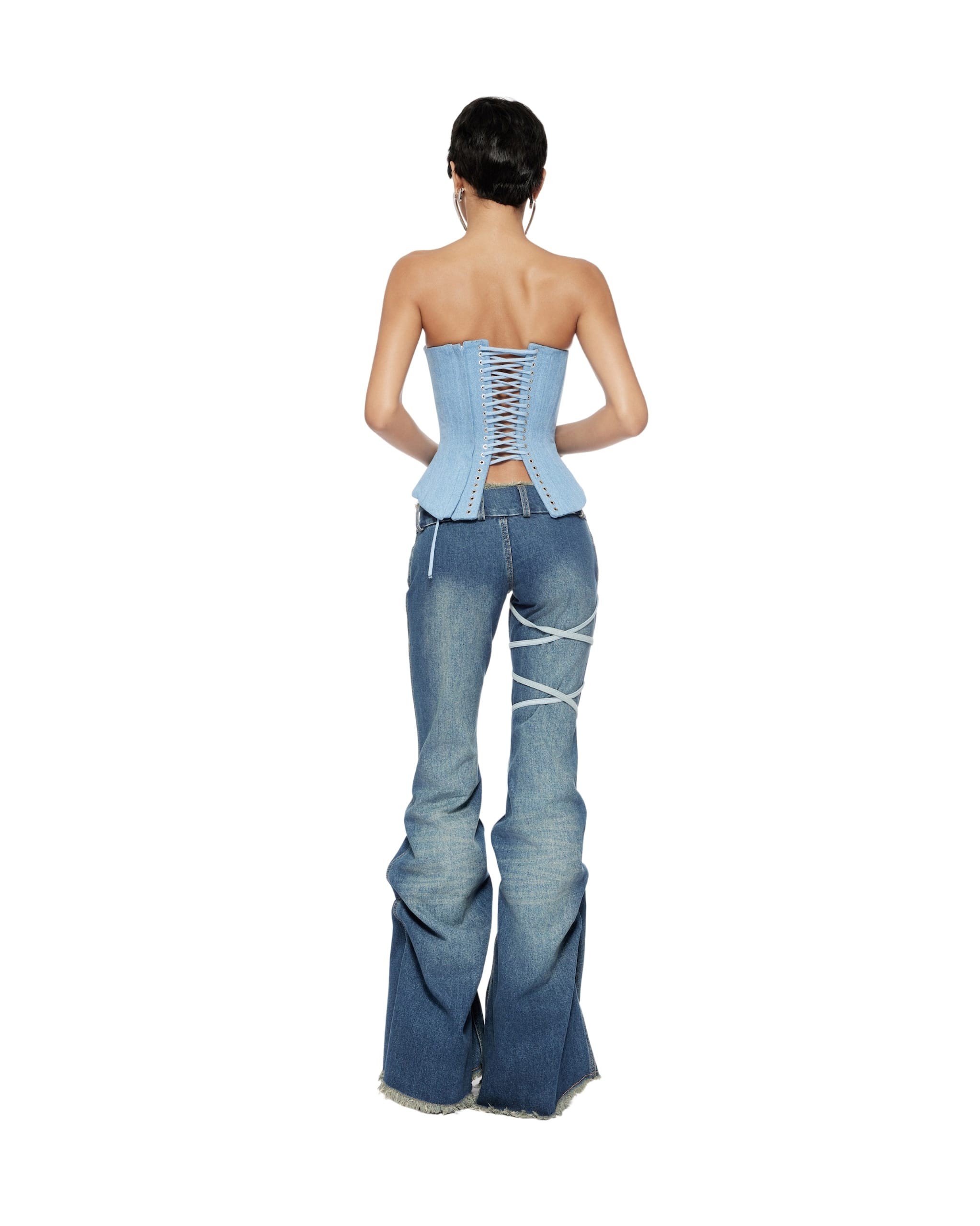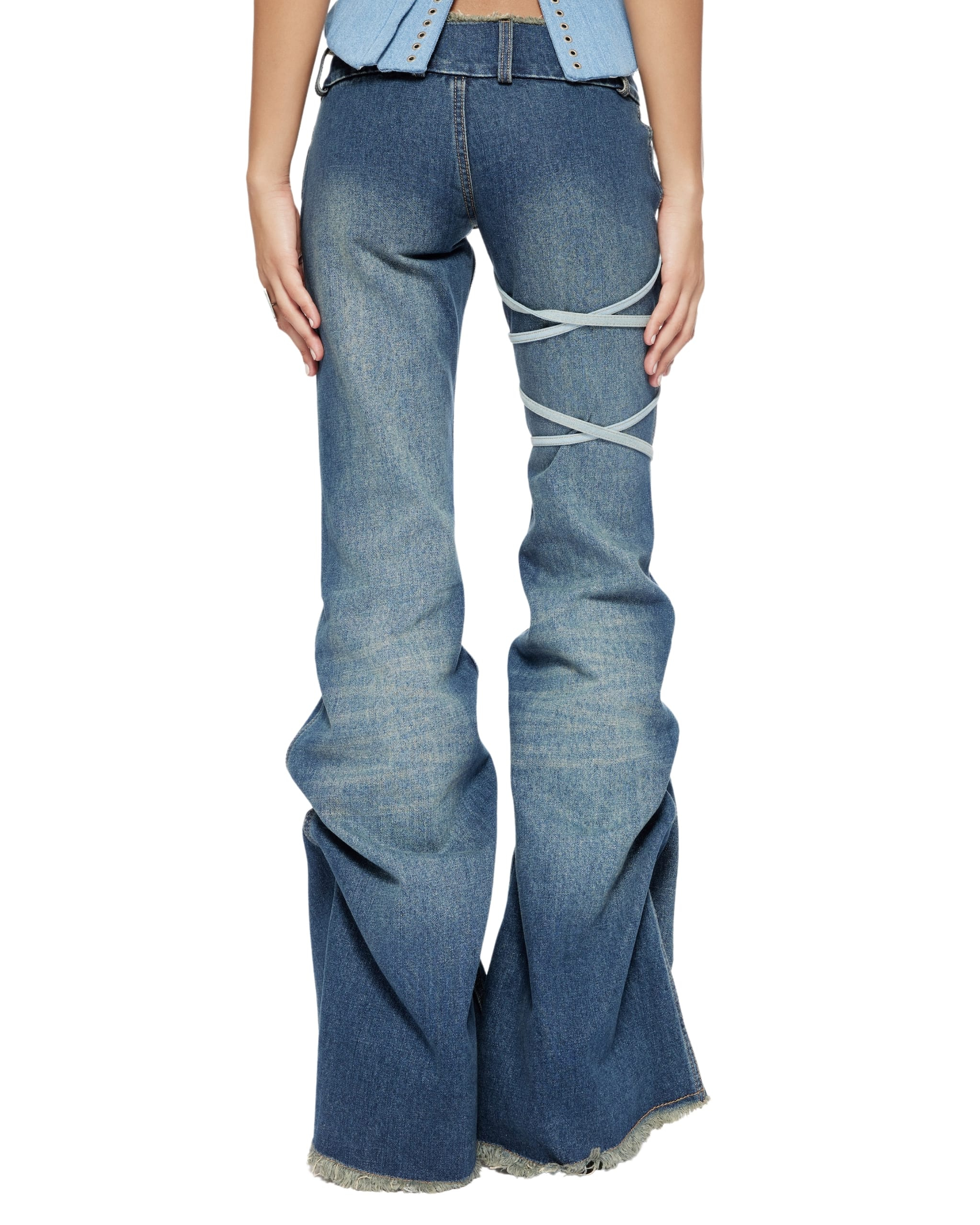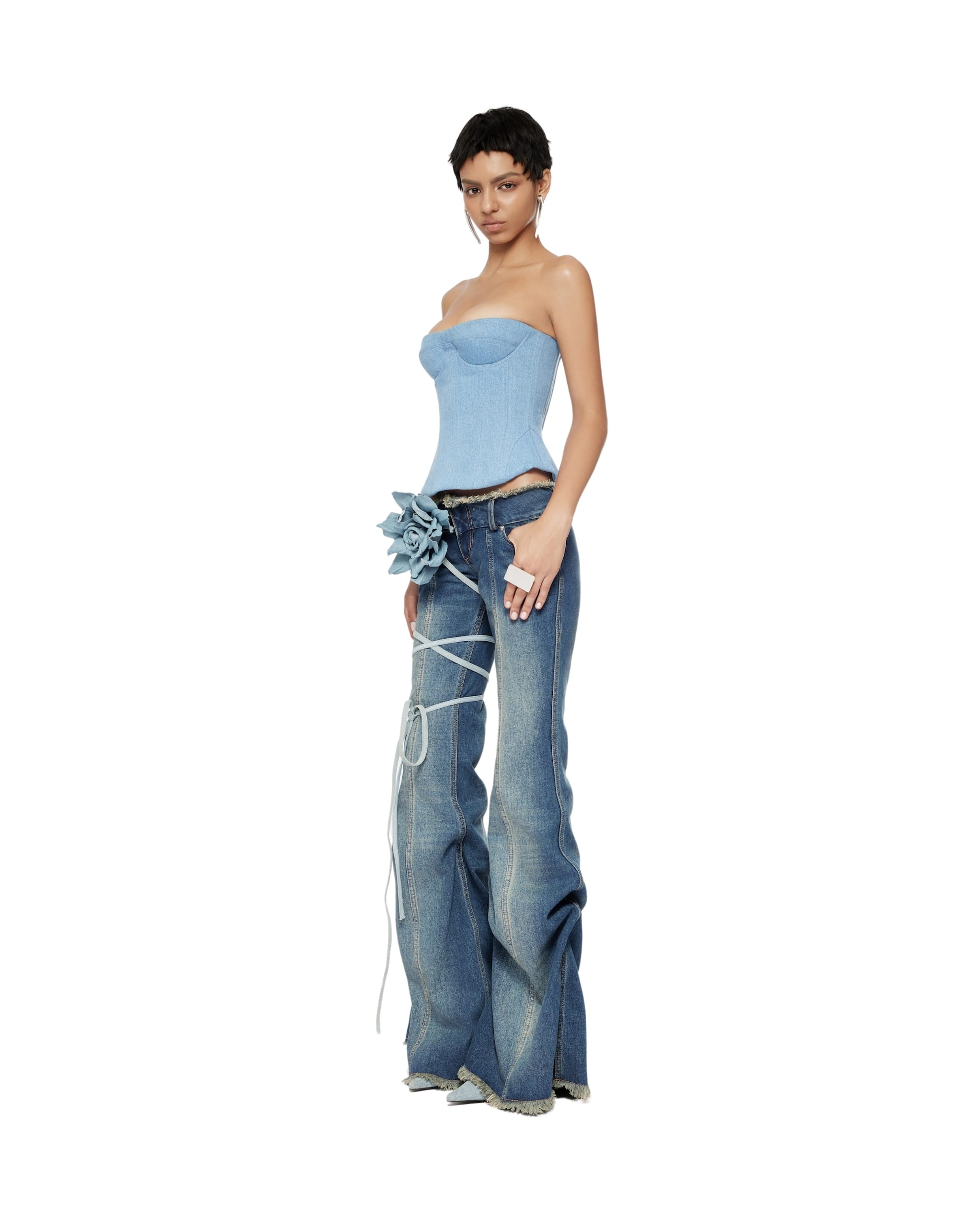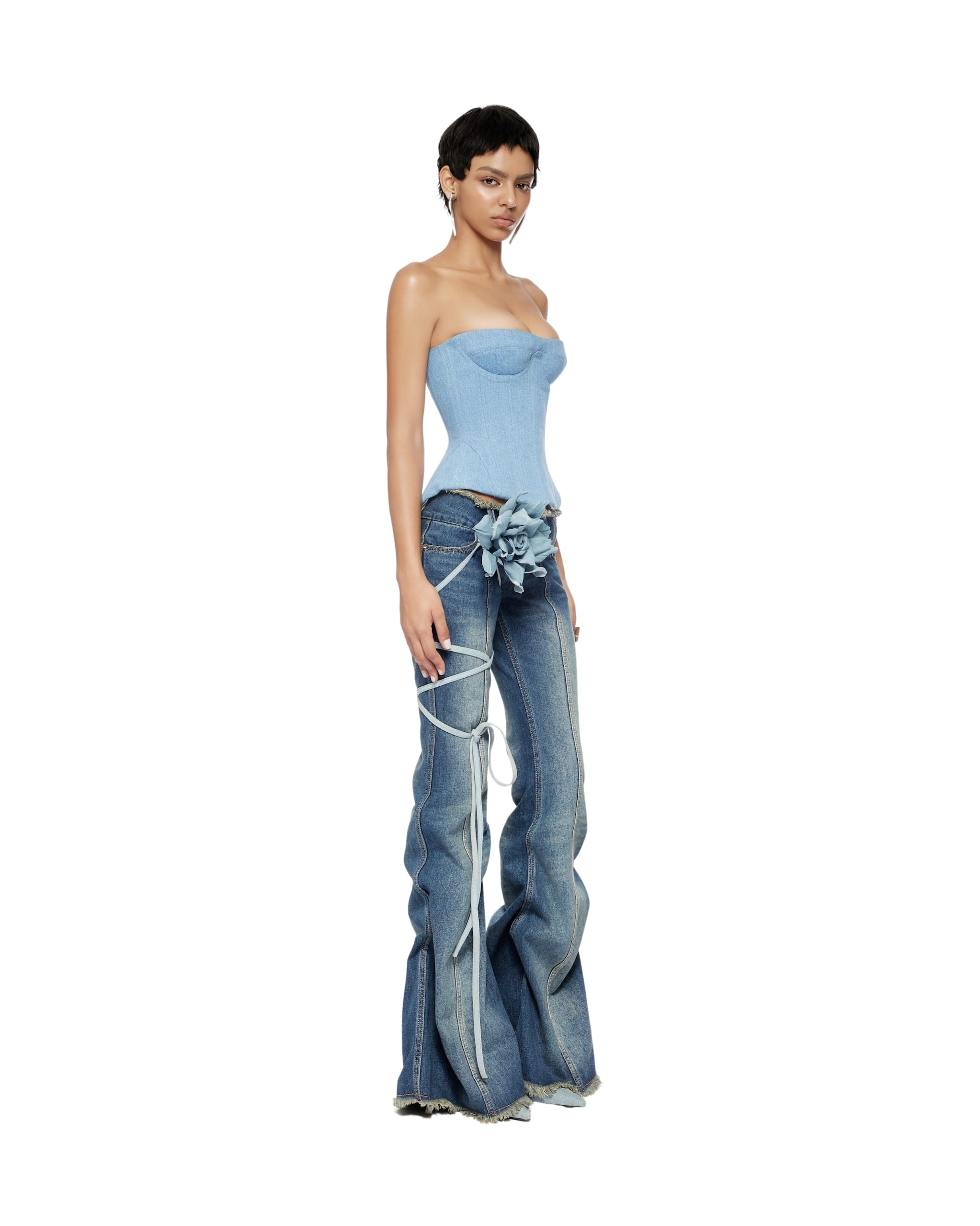 LOW-WAIST DENIM FLARE PANTS WITH FLARE SILHOUETTE, FLOWER ACCESSORY INCLUDED
