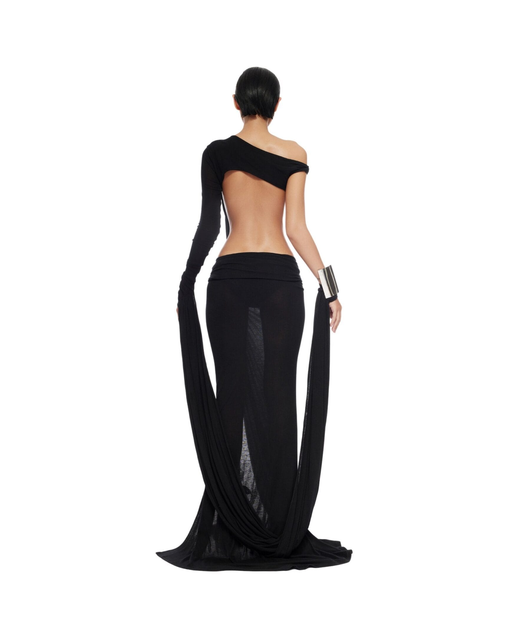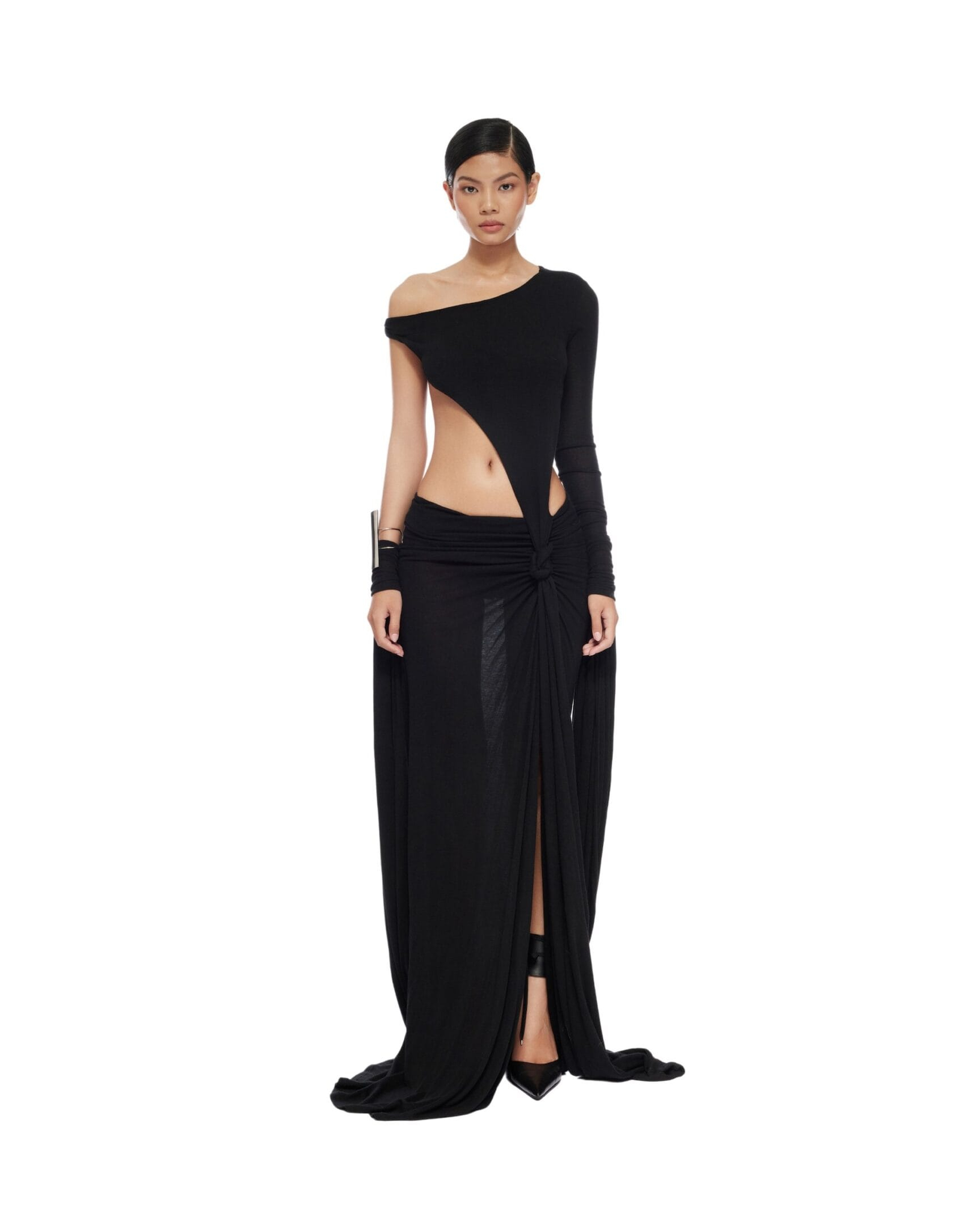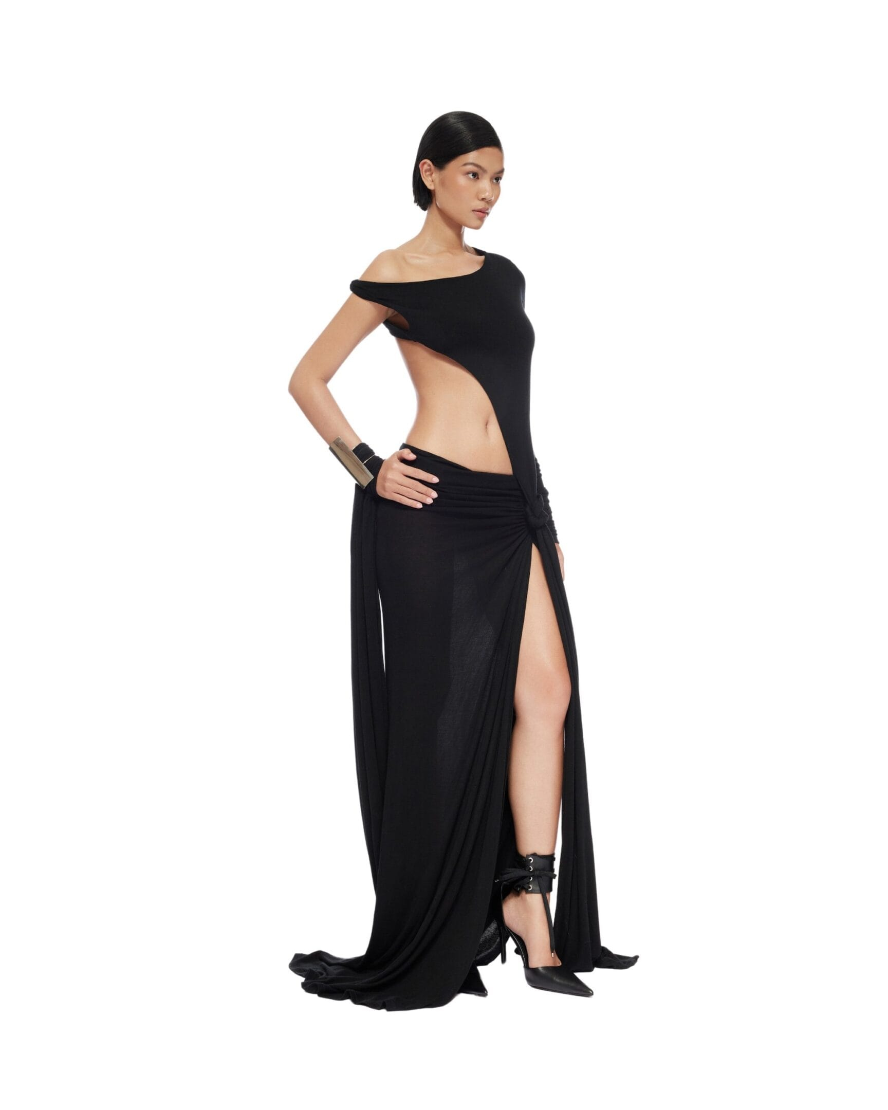 Stretch fleece blend lyocell asymmetrical slit evening dress